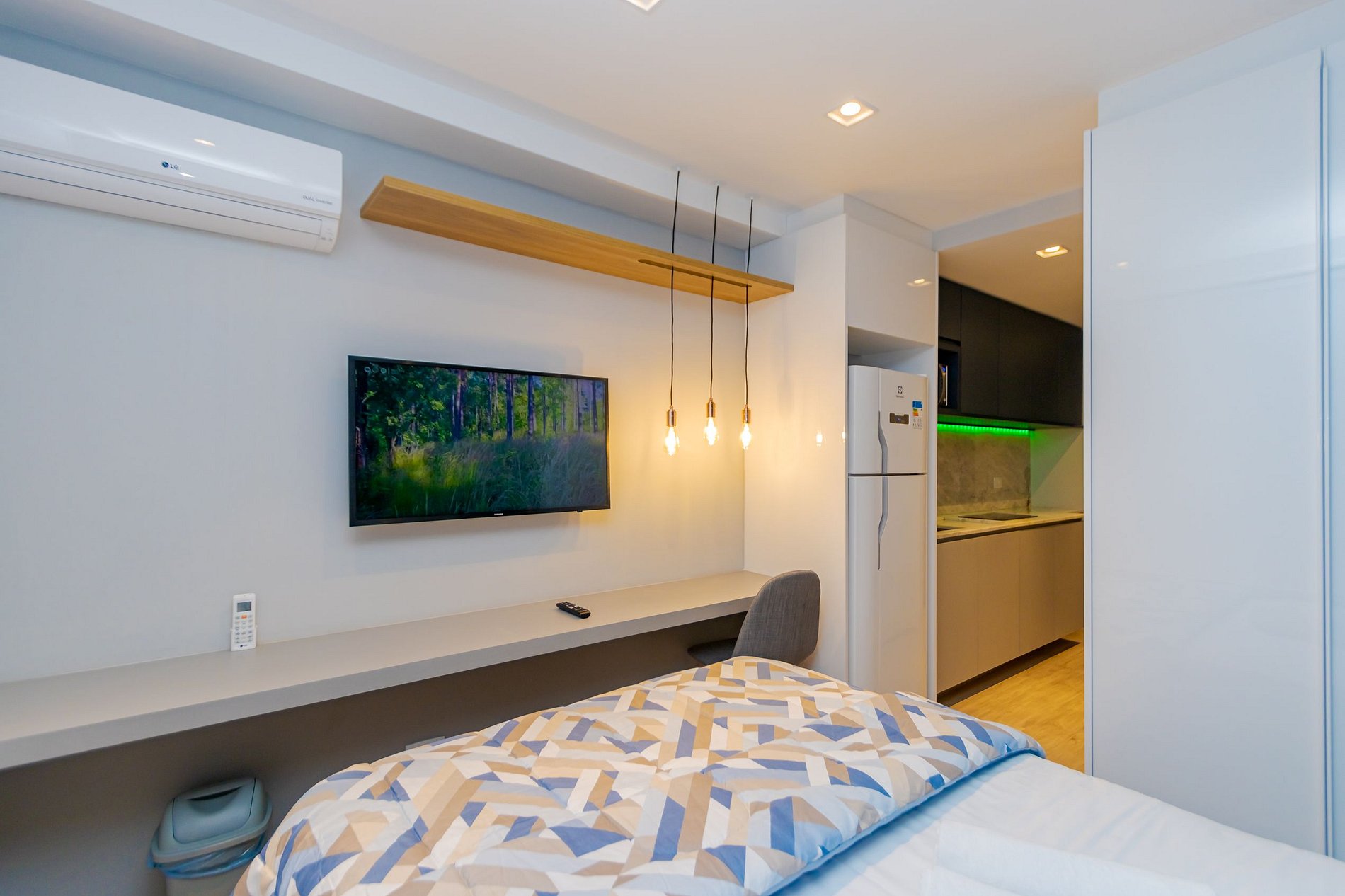 ⌂ Estúdio totalmente mobiliado que oferece as seguintes comodidades aos seus hospedes:
