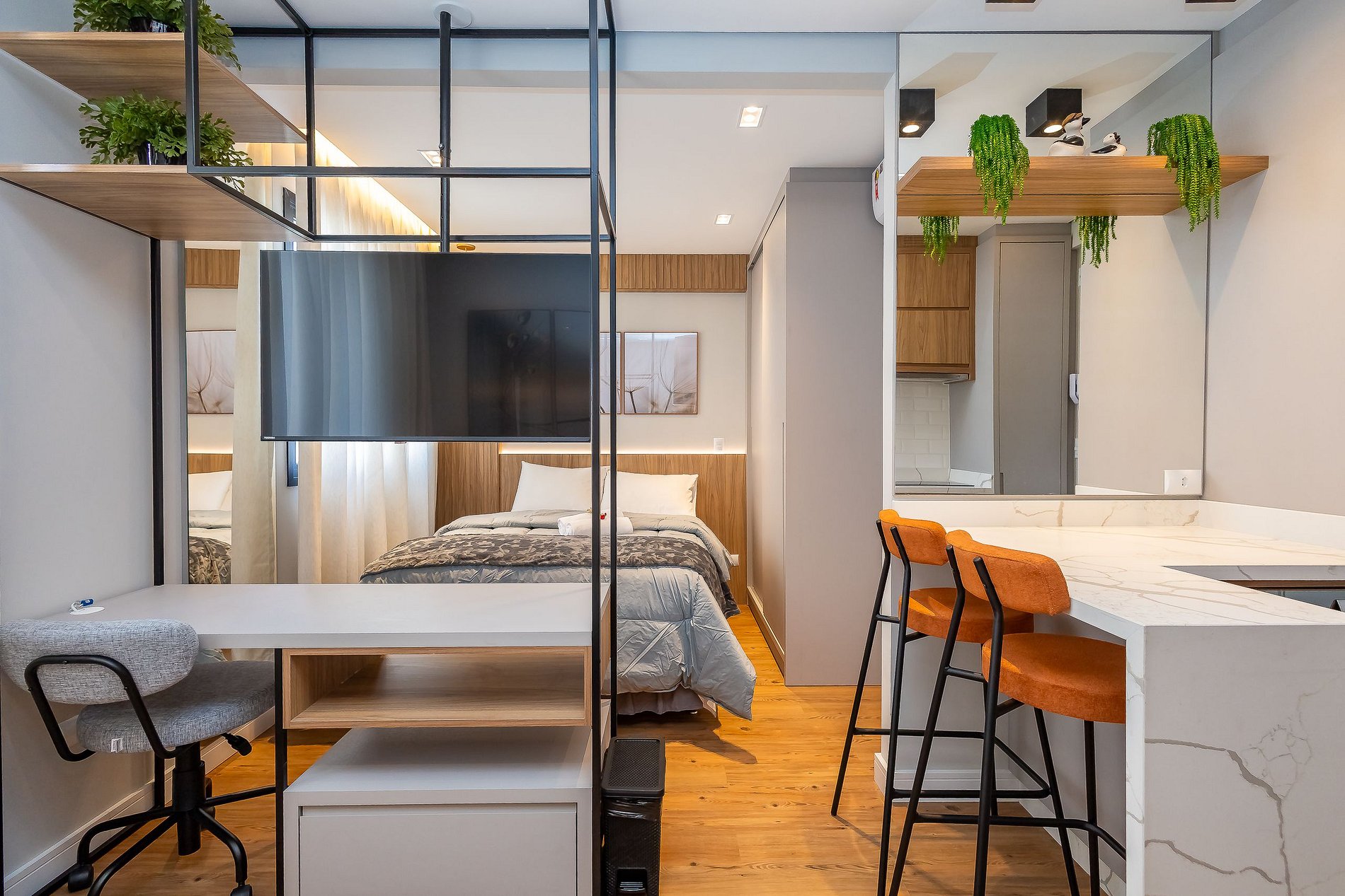 ⌂ Studio totalmente mobiliado que oferece as seguintes comodidades aos seus hospedes: