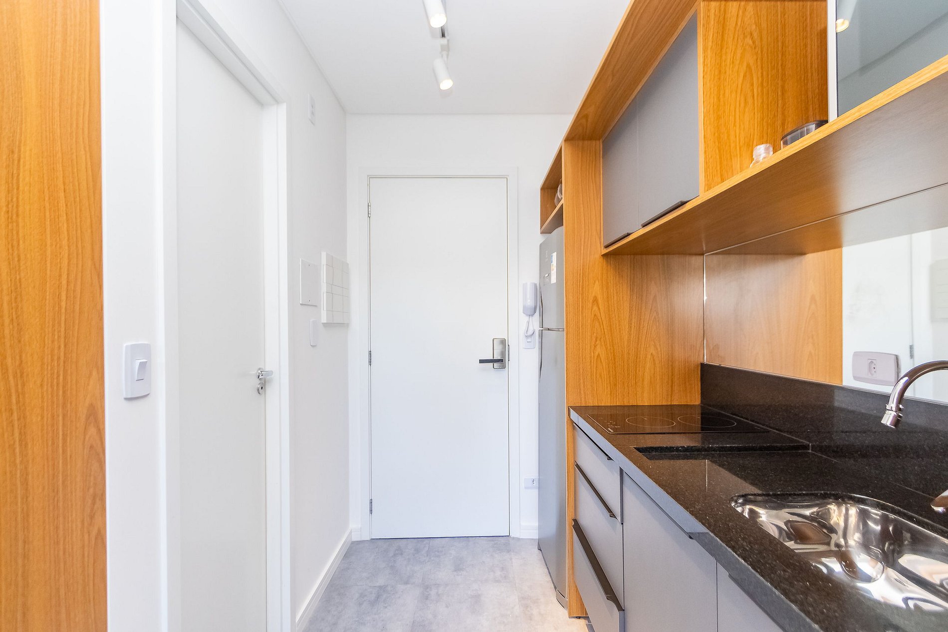 • O apartamento possui fechadura eletrônica, para aparecer o teclado numérico encoste a mão na fechadura, digite a senha e aperte o botão do cadeado aberto;