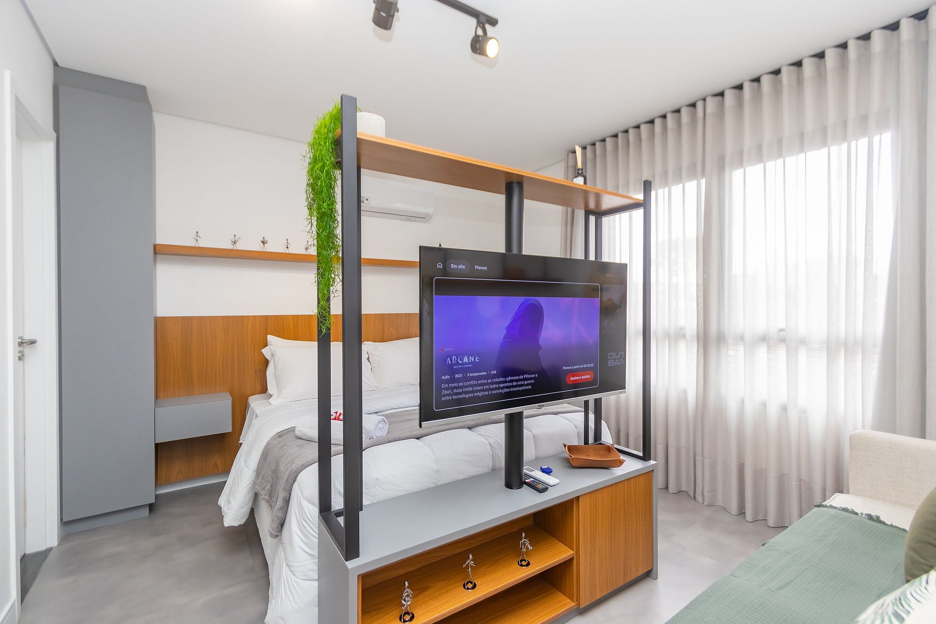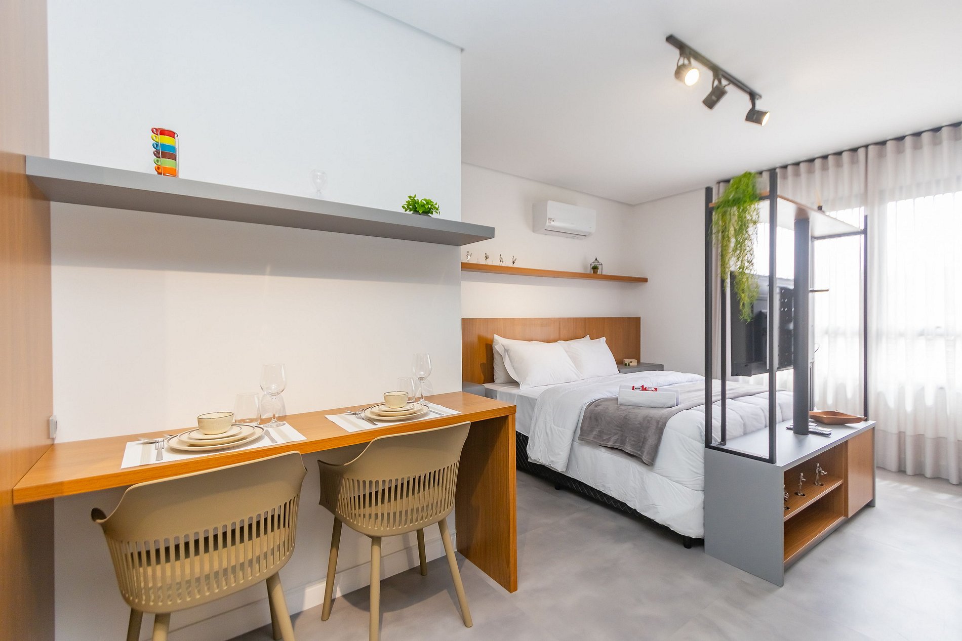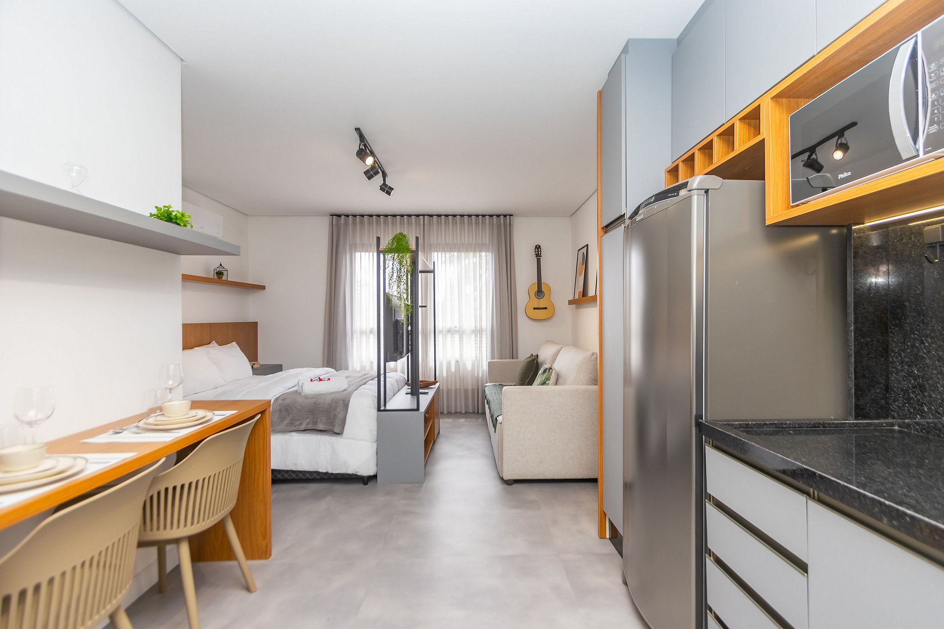 ⌂ Estúdio com Cama de Casal, Sofa-Cama de Casal e Cama Auxiliar totalmente mobiliado que oferece as seguintes comodidades aos seus hóspedes: