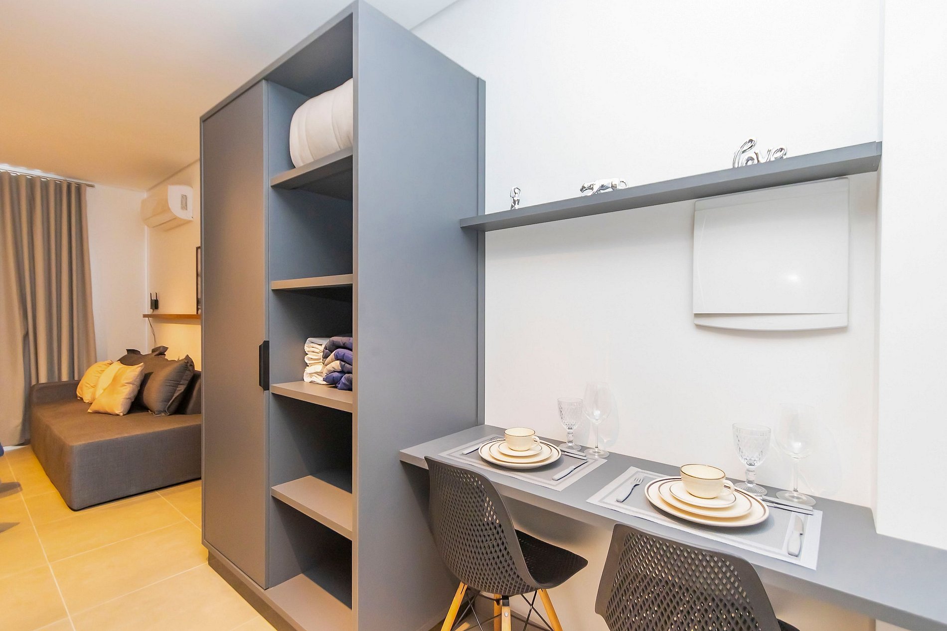 ⌂ Estúdio Plus totalmente mobiliado que oferece as seguintes comodidades aos seus hóspedes: