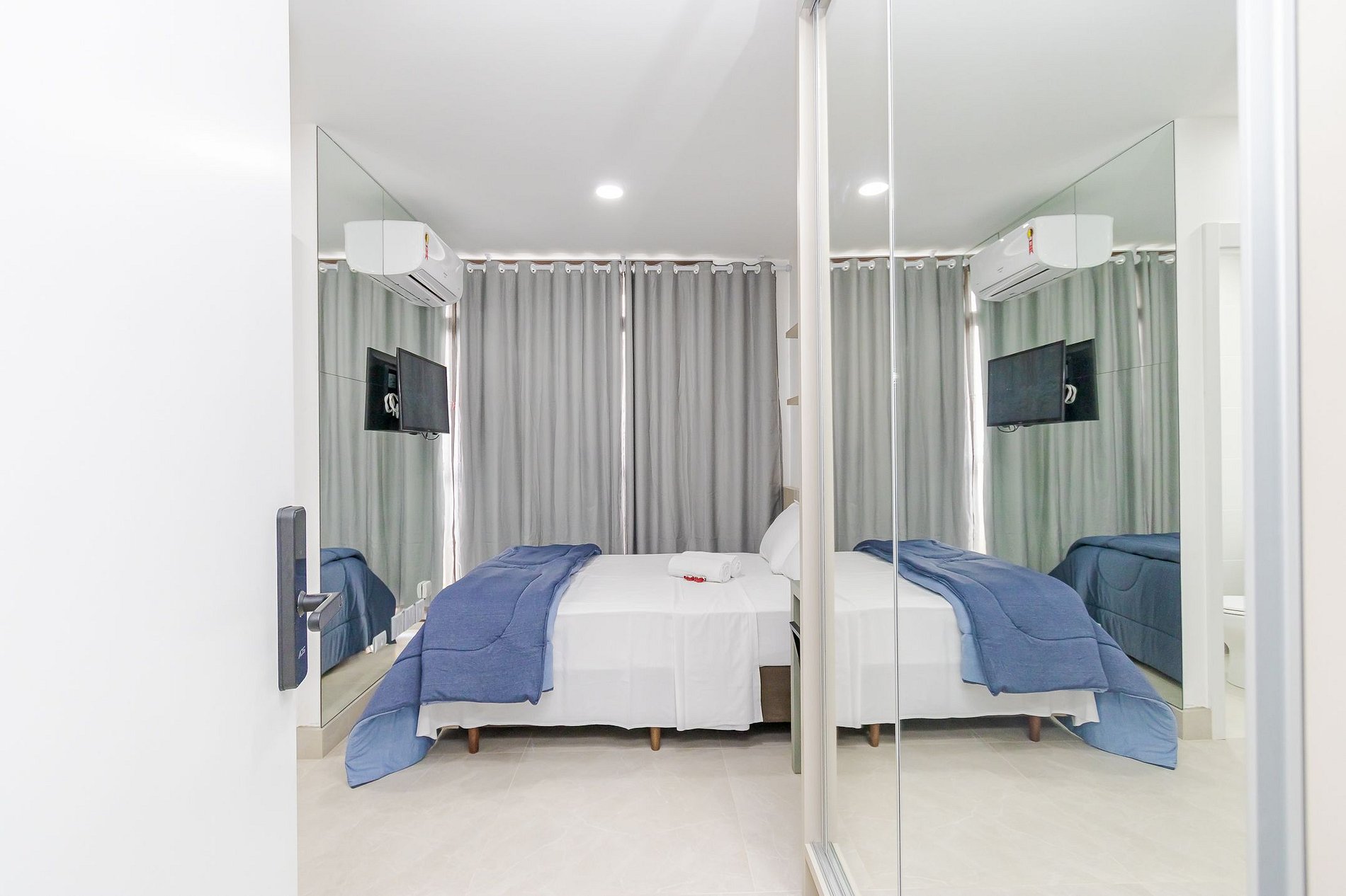 • O apartamento possui fechadura eletrônica, para aparecer o teclado numérico encoste a mão na fechadura, digite a senha e aperte o botão do cadeado aberto;