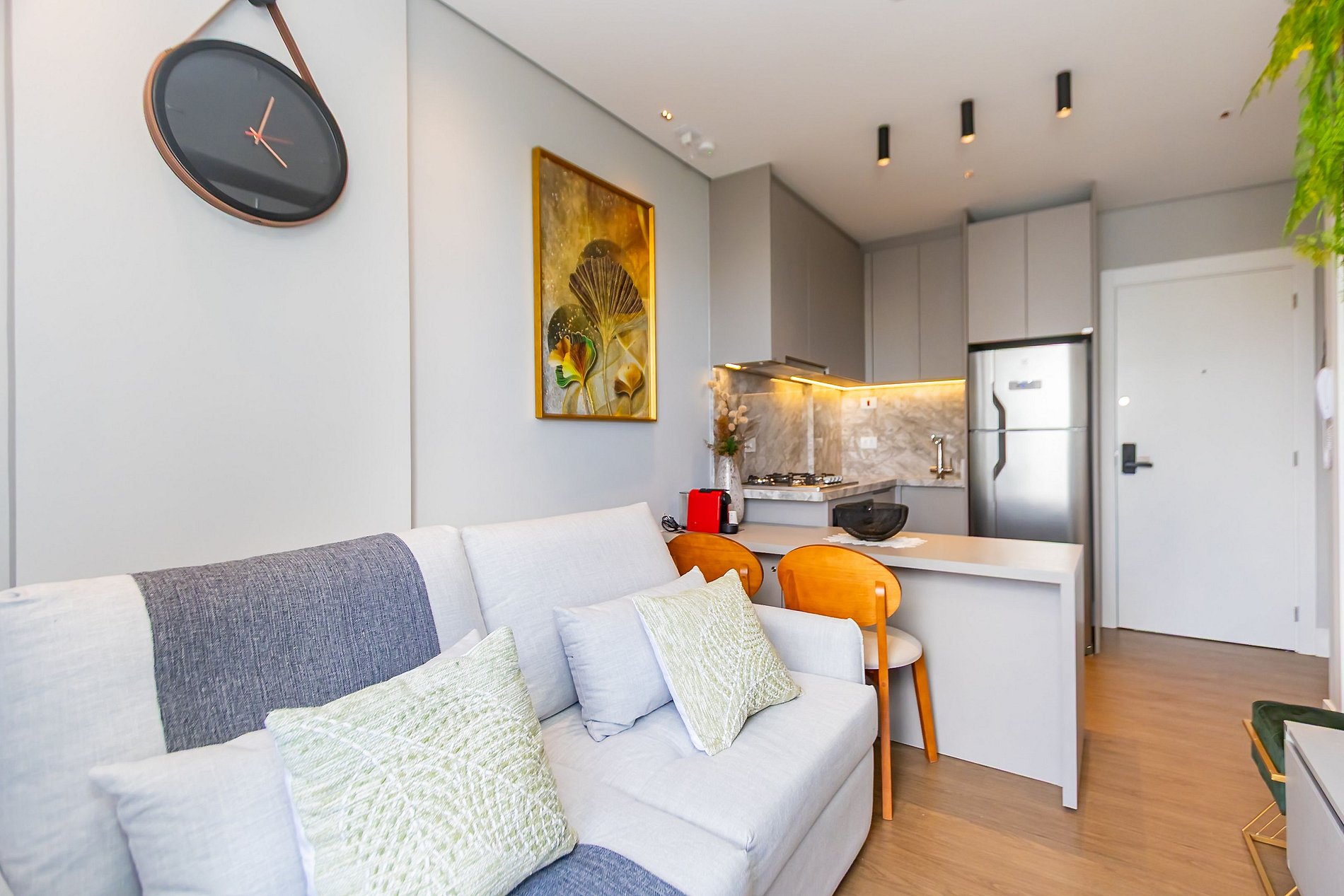 • O apartamento possui fechadura eletrônica, para aparecer o teclado numérico encoste a mão na fechadura, digite a senha e aperte o botão do cadeado aberto;