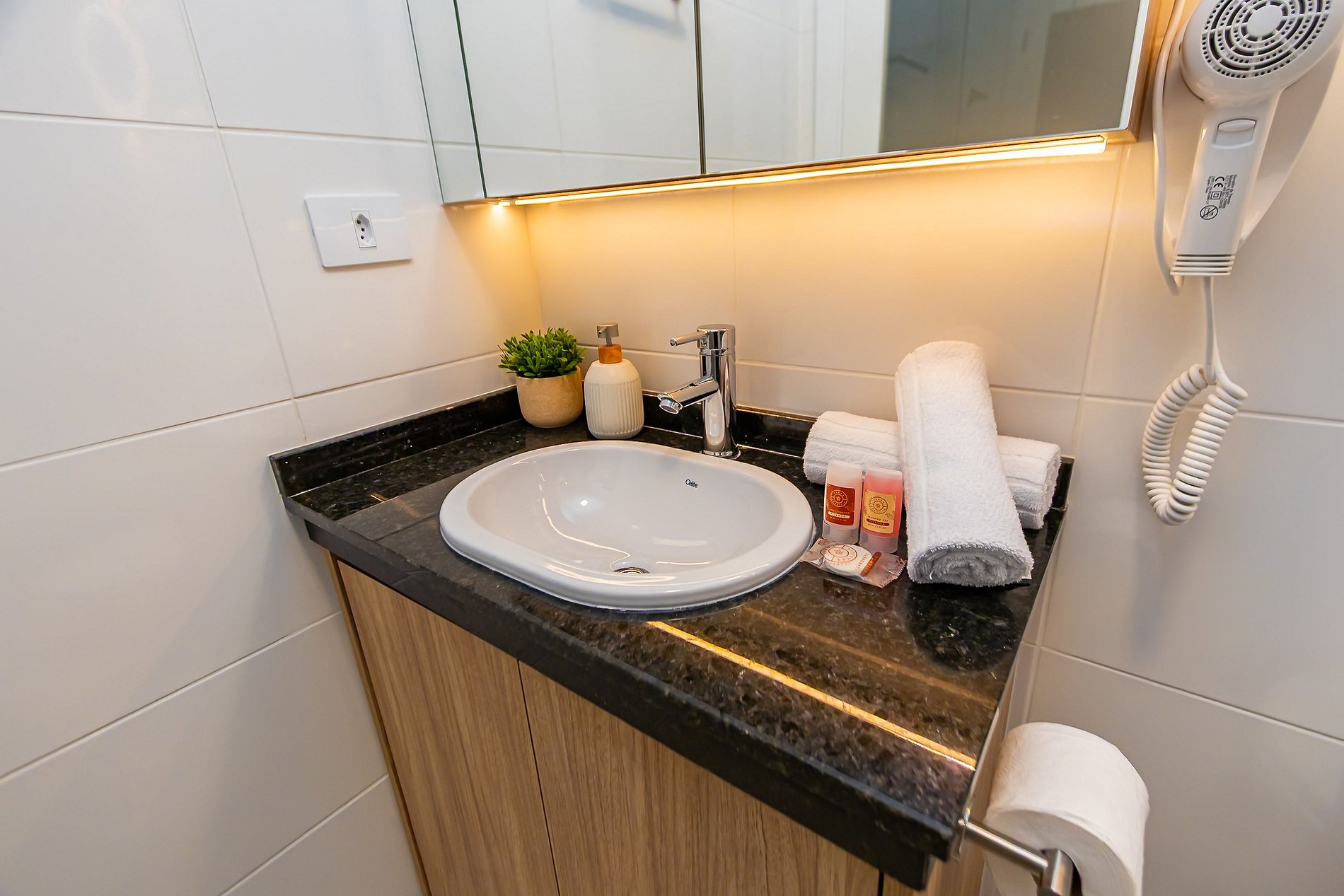 Durante a sua estadia não temos serviço de quarto e nem fazemos a reposição dos itens da sua unidade como: shampoo, condicionador, sabonete, papel higiênico, pano de prato, esponja e detergente de louça, além de pilhas do controle remoto, ar-condicionado e da fechadura eletrônica. A reposição destes itens é de responsabilidade do hóspede titular da reserva.