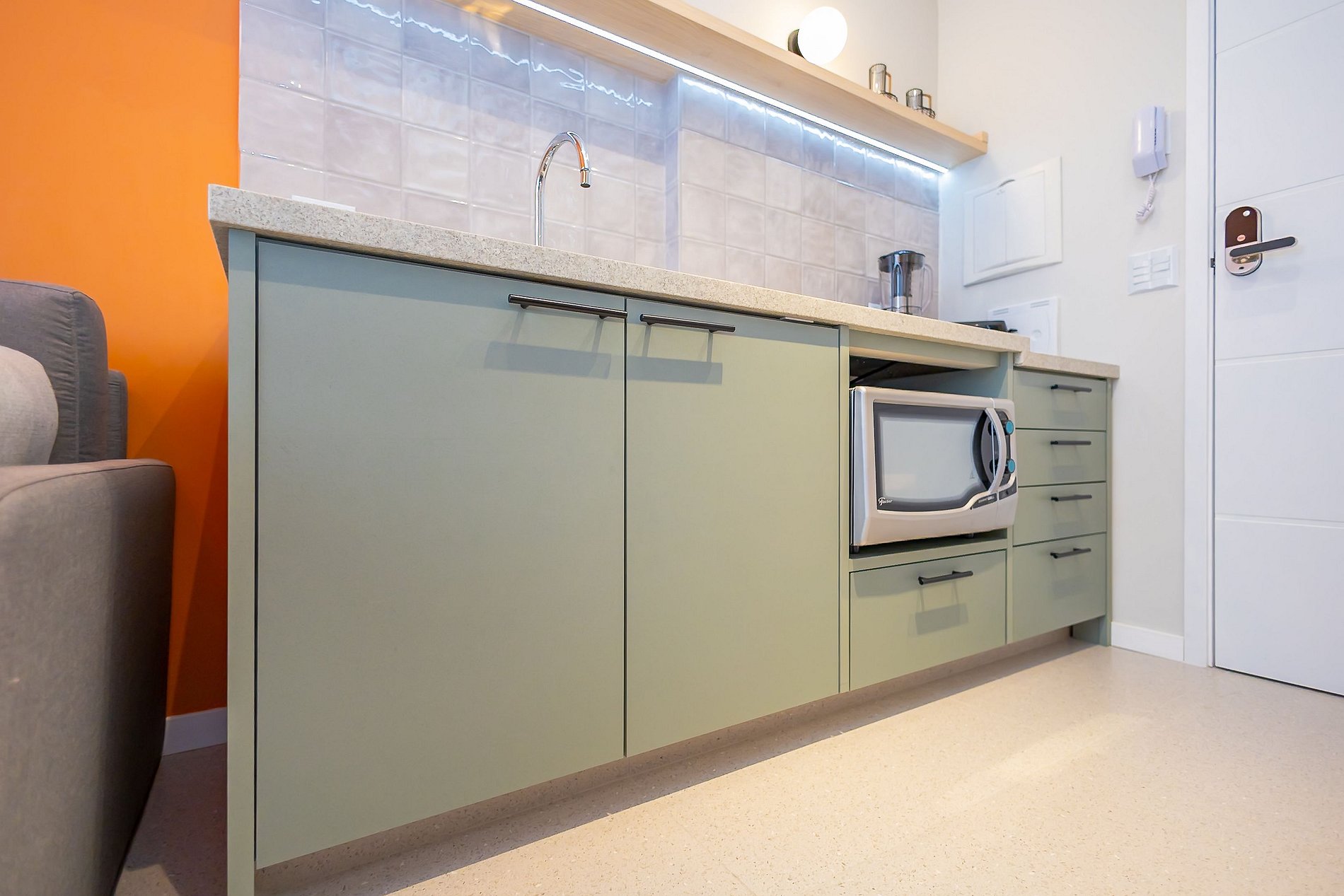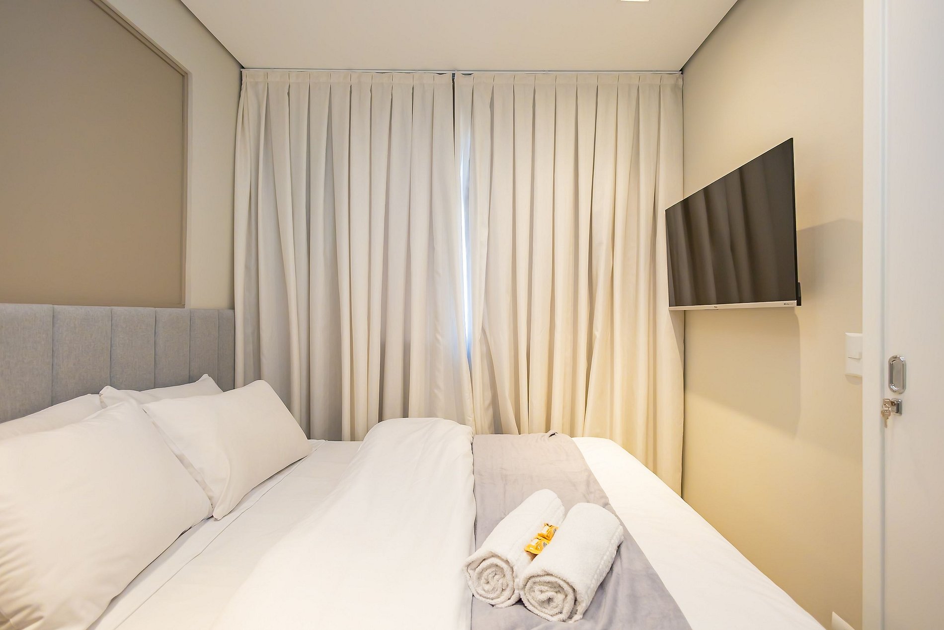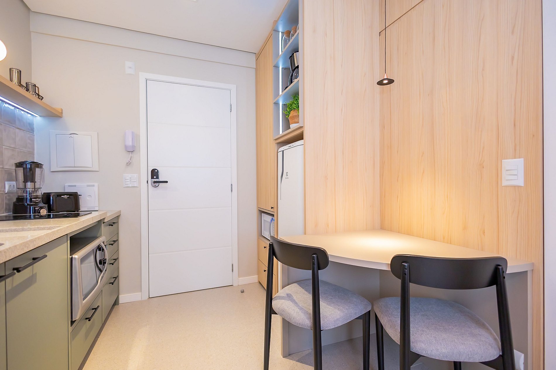 • O apartamento possui fechadura eletrônica, para aparecer o teclado numérico encoste a mão na fechadura, digite a senha e aperte o botão do cadeado aberto;