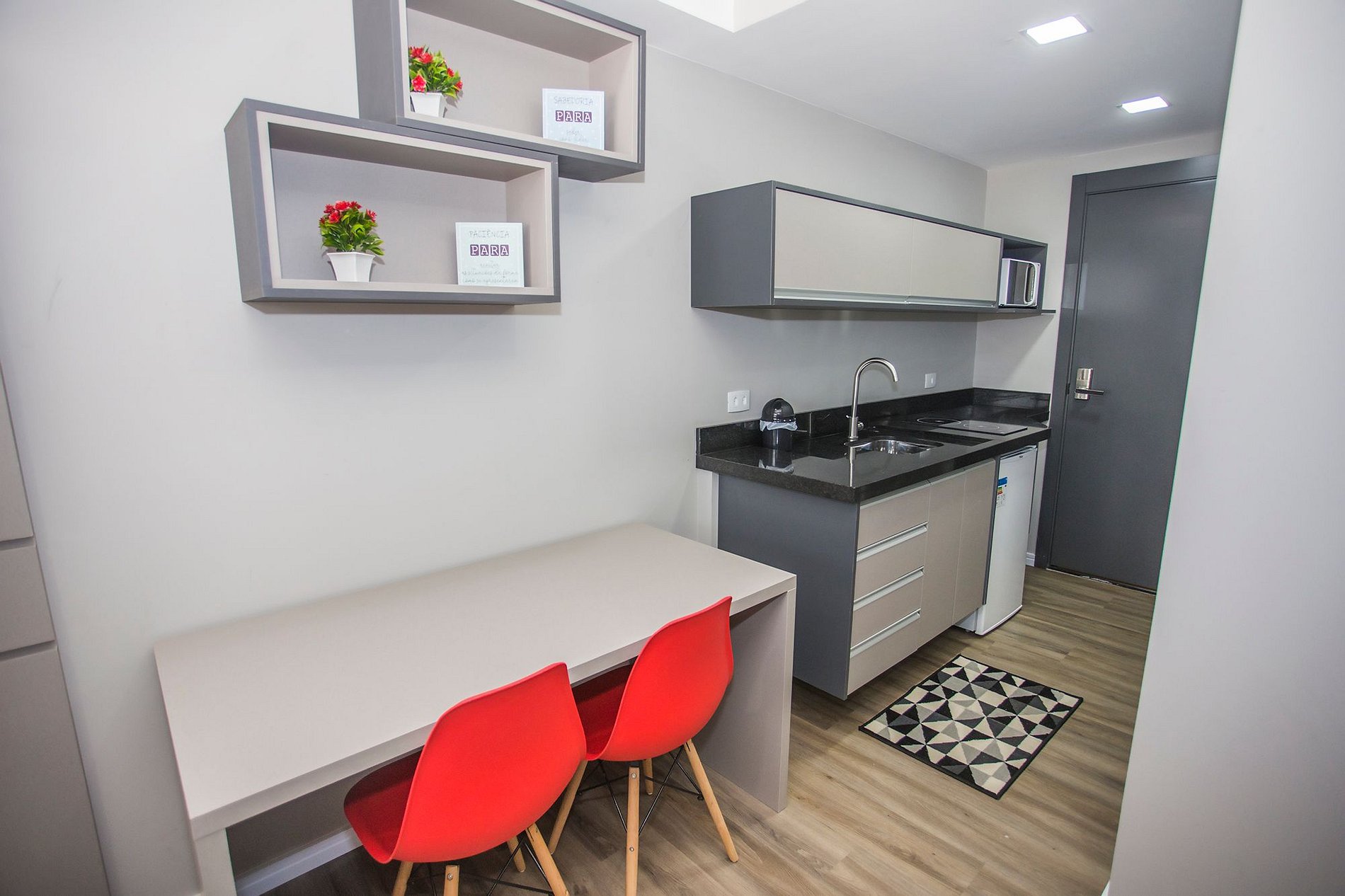 • O apartamento possui fechadura eletrônica, para aparecer o teclado numérico encoste a mão na fechadura, digite a senha e aperte o botão do cadeado aberto;
