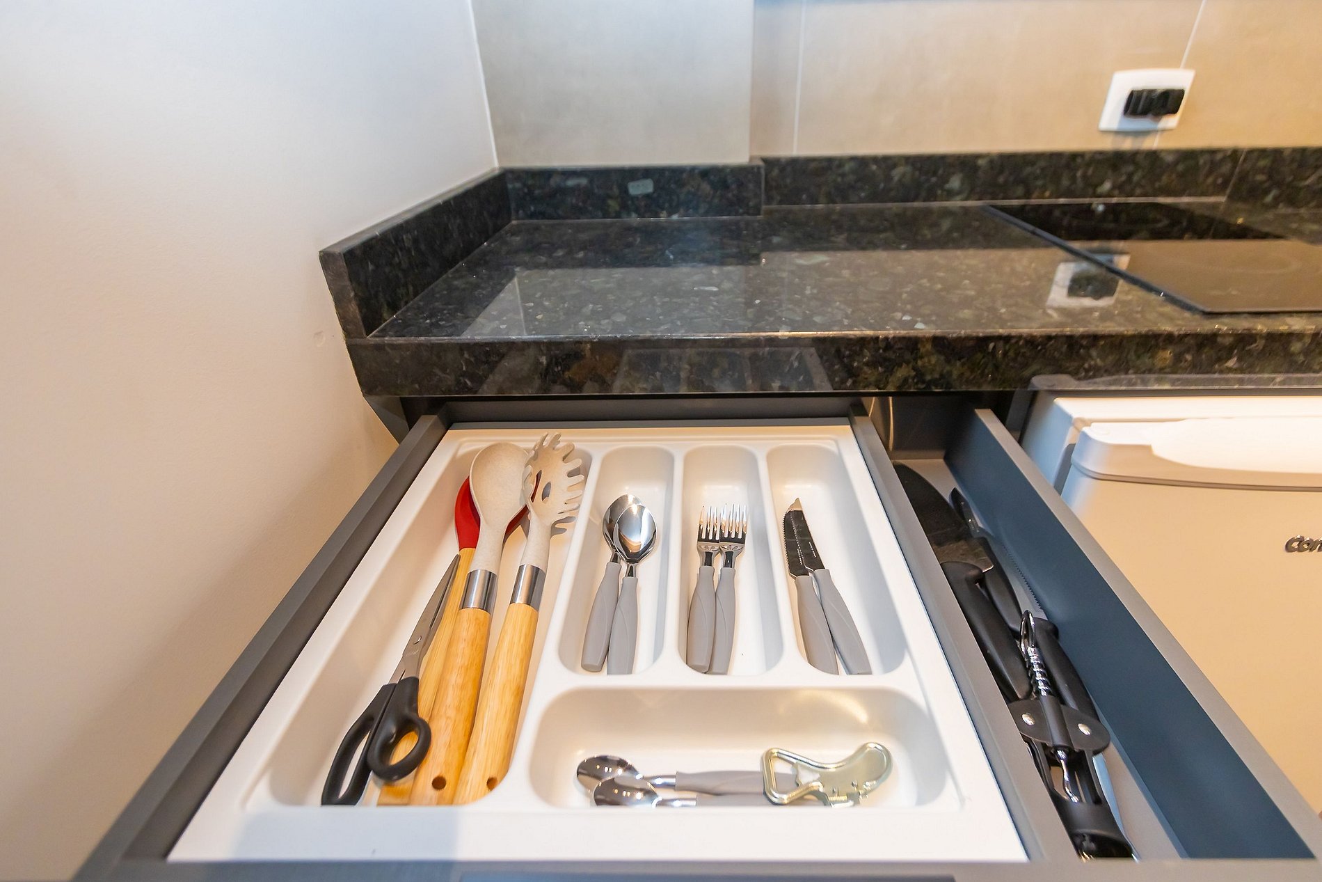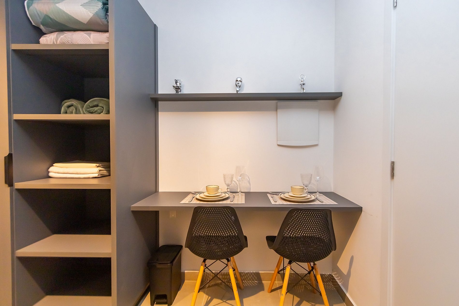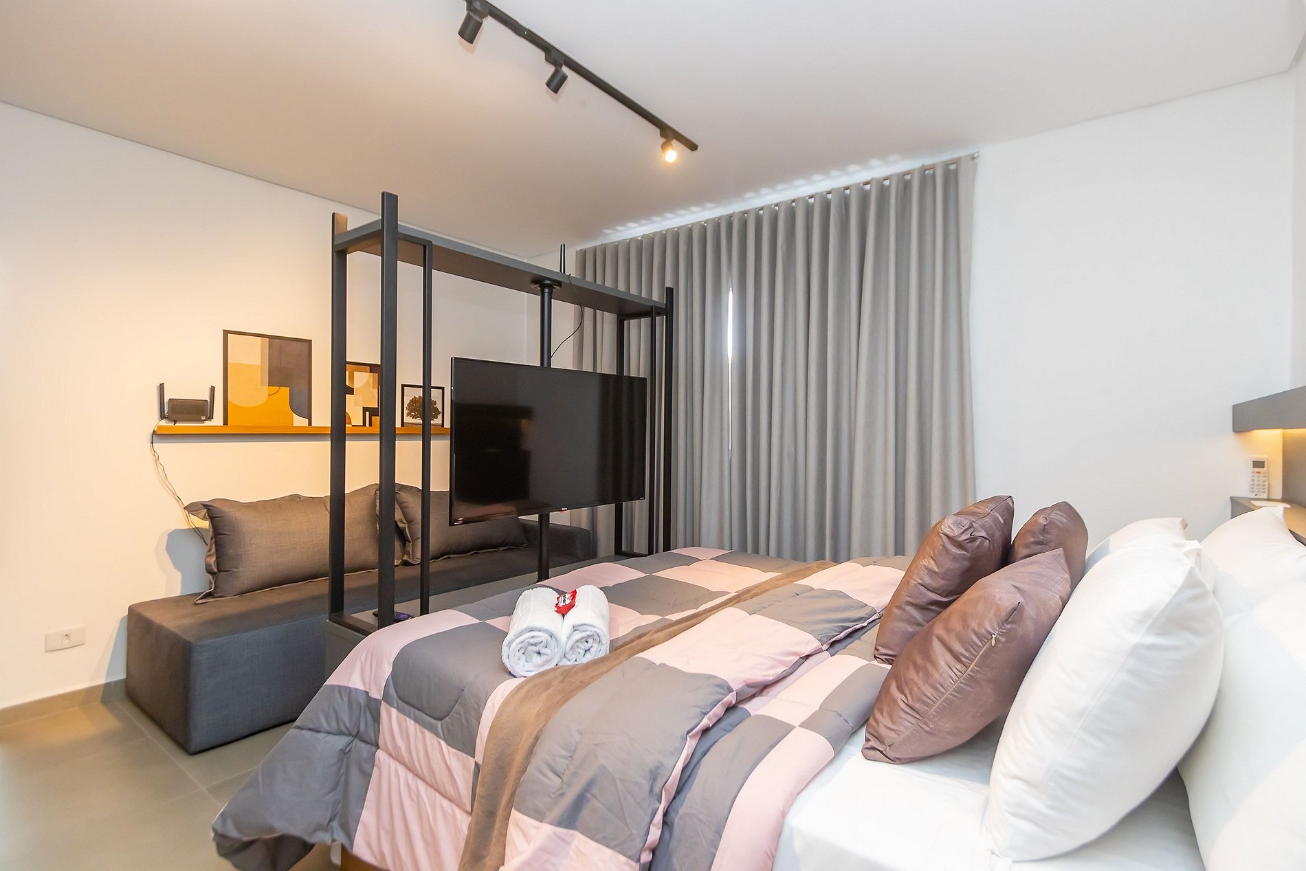 ⌂ Estúdio com Cama de Casal, Sofa-Cama e Cama Auxiliar totalmente mobiliado que oferece as seguintes comodidades aos seus hóspedes: