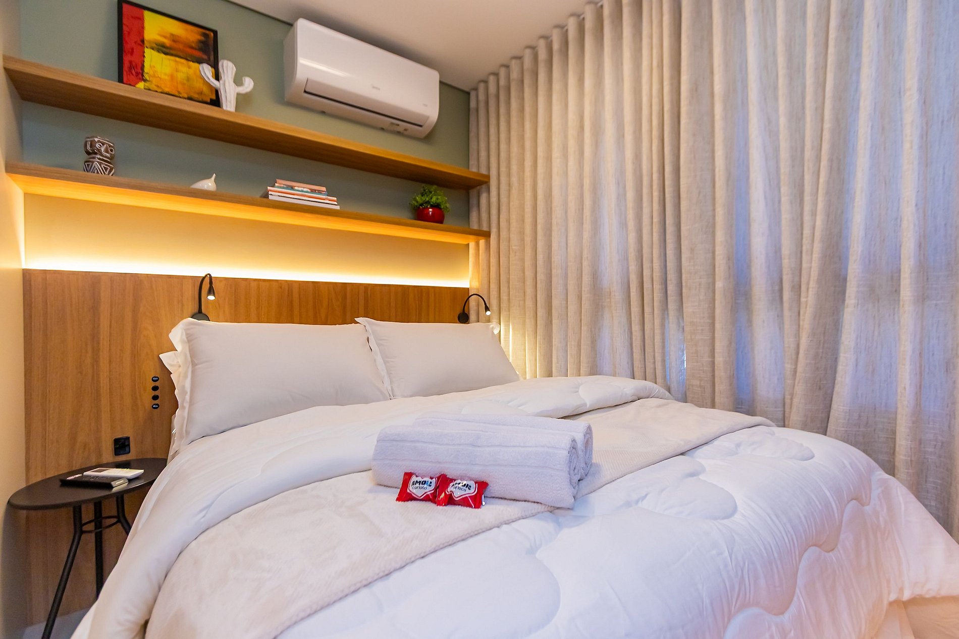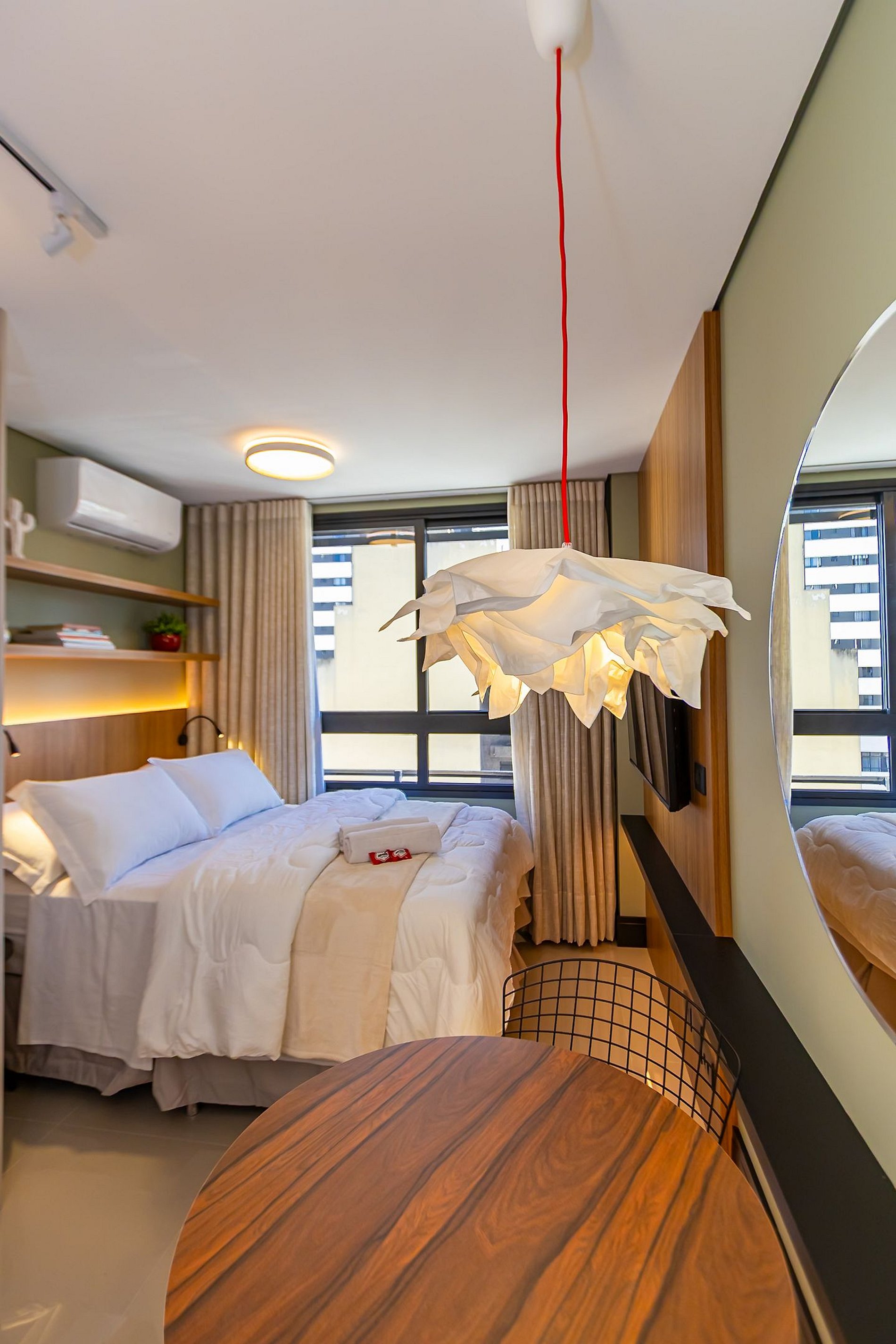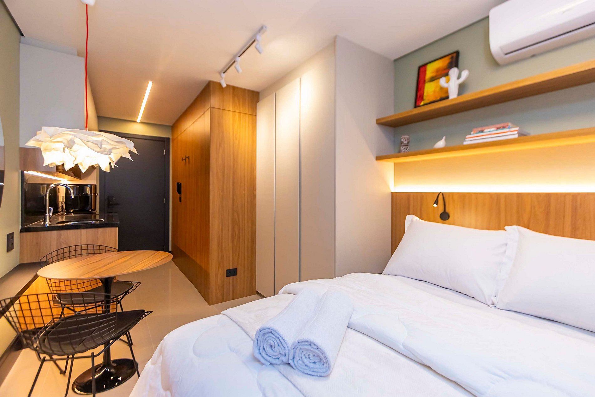 Studio ideal para até 2 pessoas, com decoração moderna, aconchegante e cuidadosamente planejada para proporcionar conforto e bem-estar. Localizado em um edifício novo, com estrutura completa e de alto padrão. Situado em uma ótima região, com fácil acesso a restaurantes, comércios, serviços e transporte. Uma excelente opção para quem busca praticidade, elegância e uma estadia agradável, com estilo e comodidade em cada detalhe.
