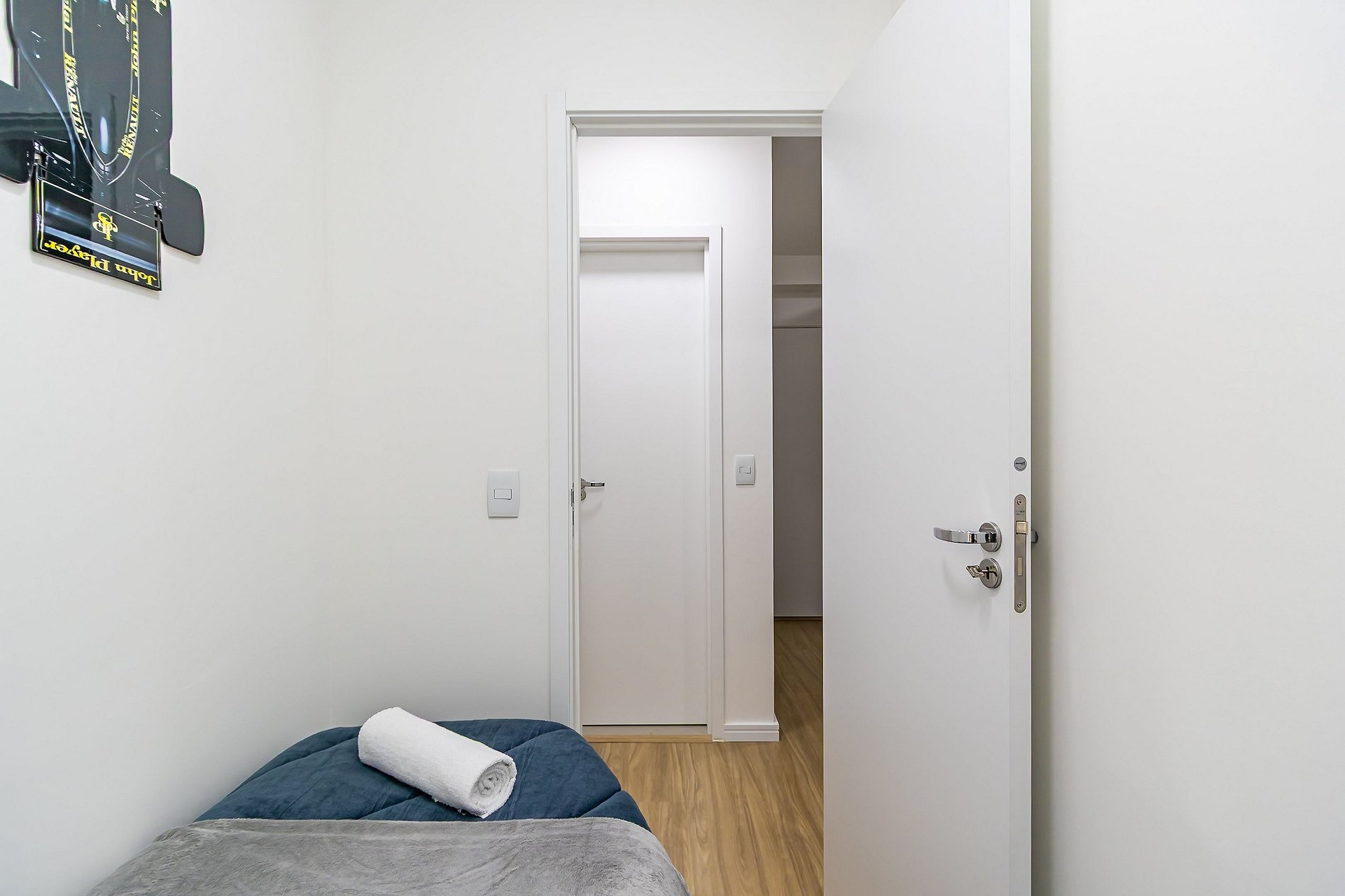 • O apartamento possui fechadura eletrônica, para aparecer o teclado numérico encoste a mão na fechadura, digite a senha e aperte o botão do cadeado aberto;