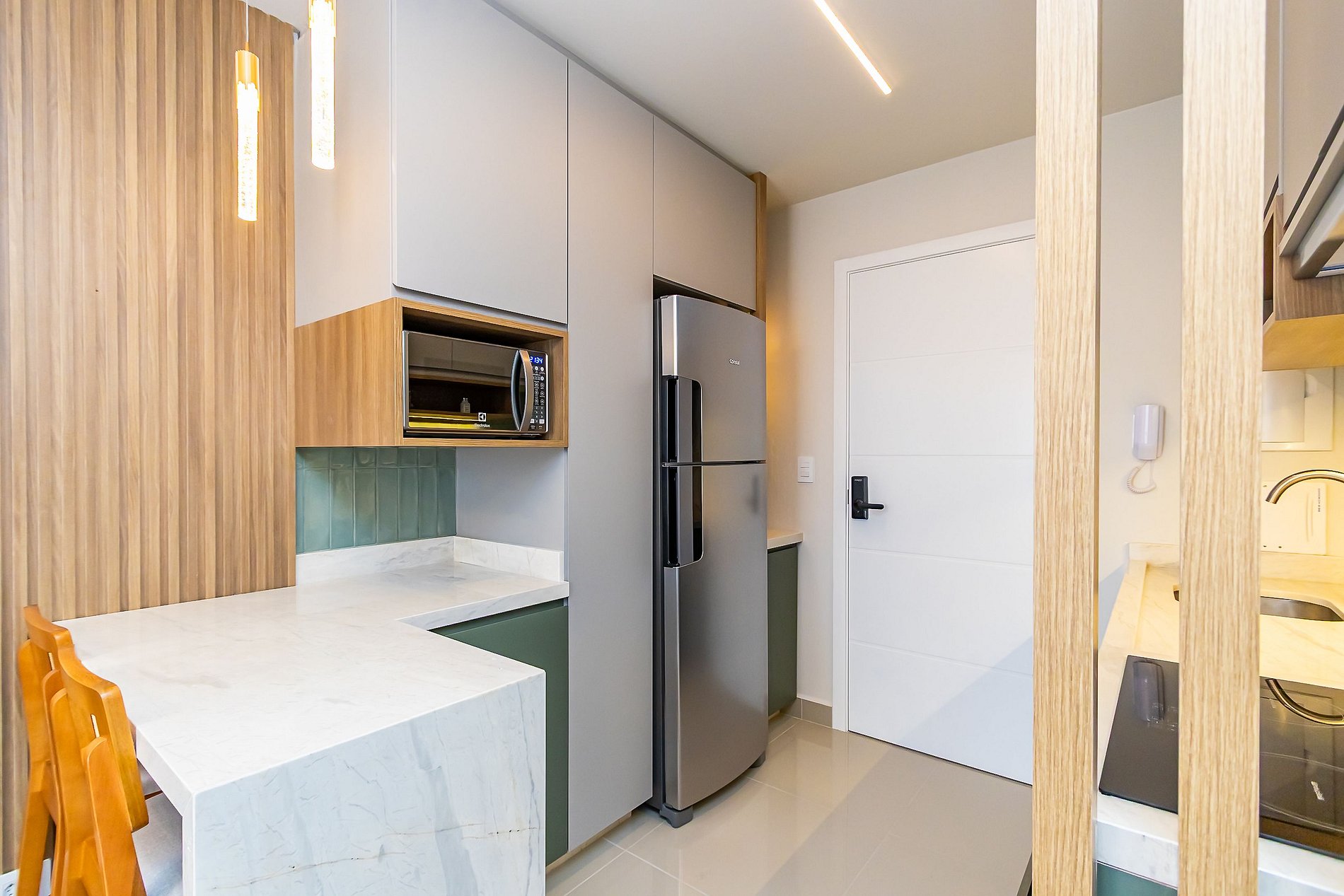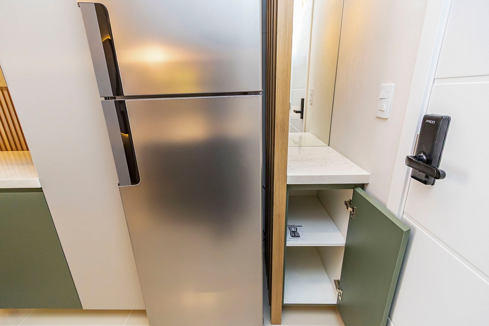 • O apartamento possui fechadura eletrônica, para aparecer o teclado numérico encoste a mão na fechadura, digite a senha e aperte o botão do cadeado aberto;