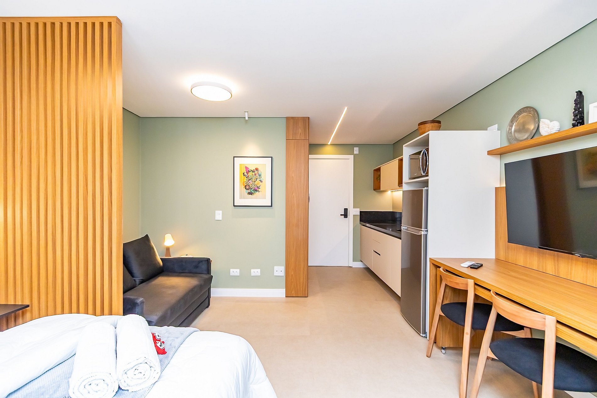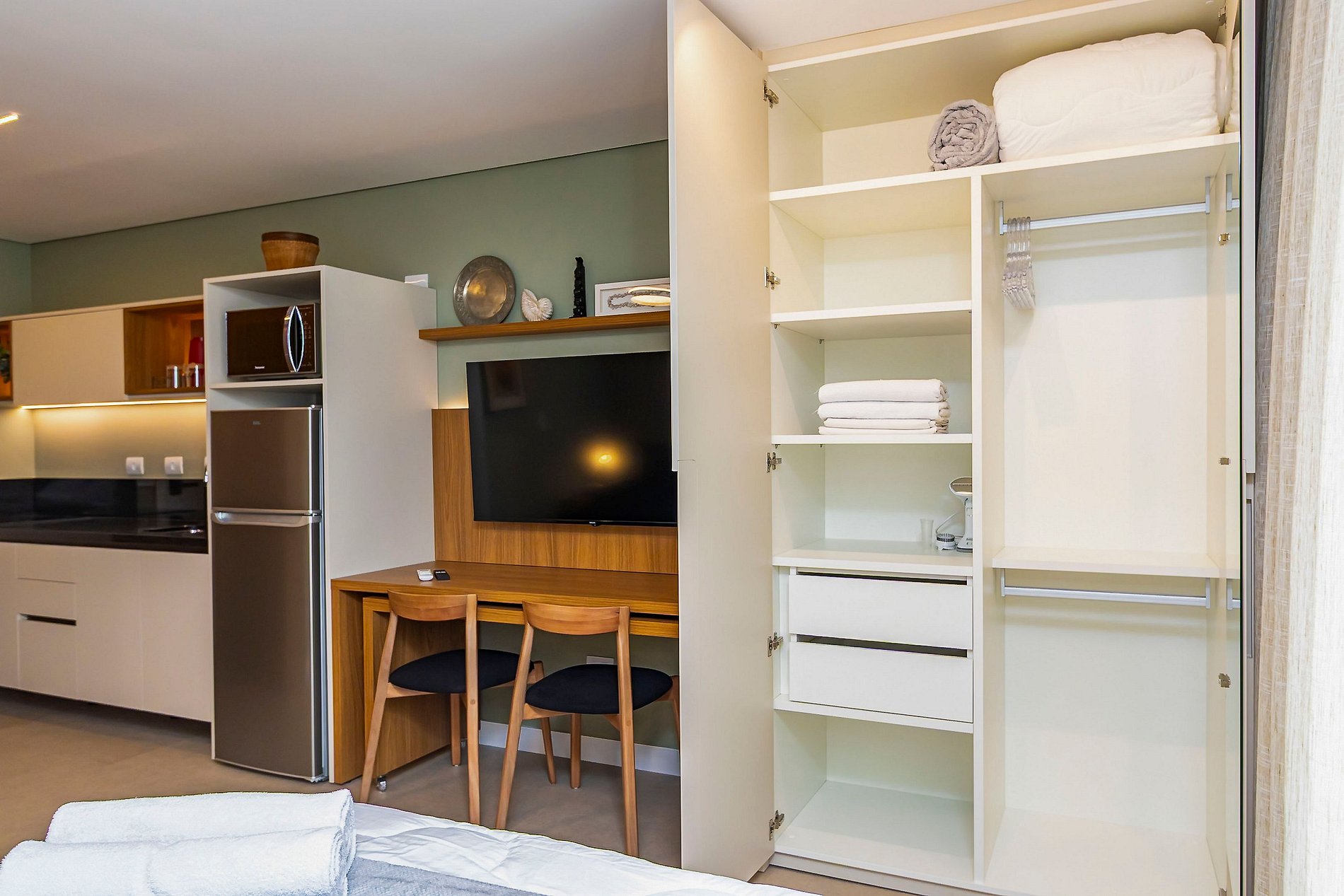 ⌂ Studio totalmente mobiliado que oferece as seguintes comodidades aos seus hóspedes: