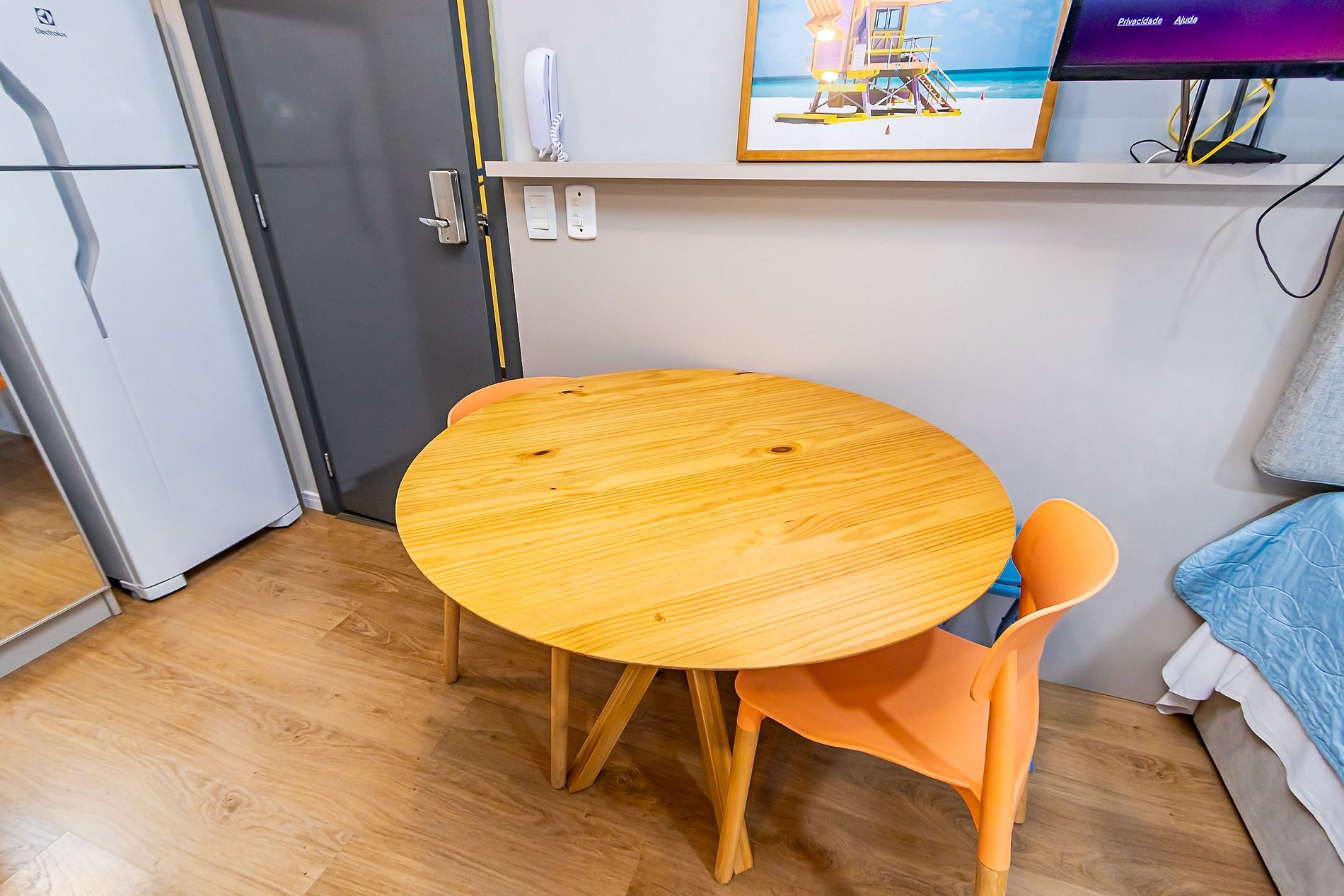 • O apartamento possui fechadura eletrônica, para aparecer o teclado numérico encoste a mão na fechadura, digite a senha e aperte o botão do cadeado aberto;