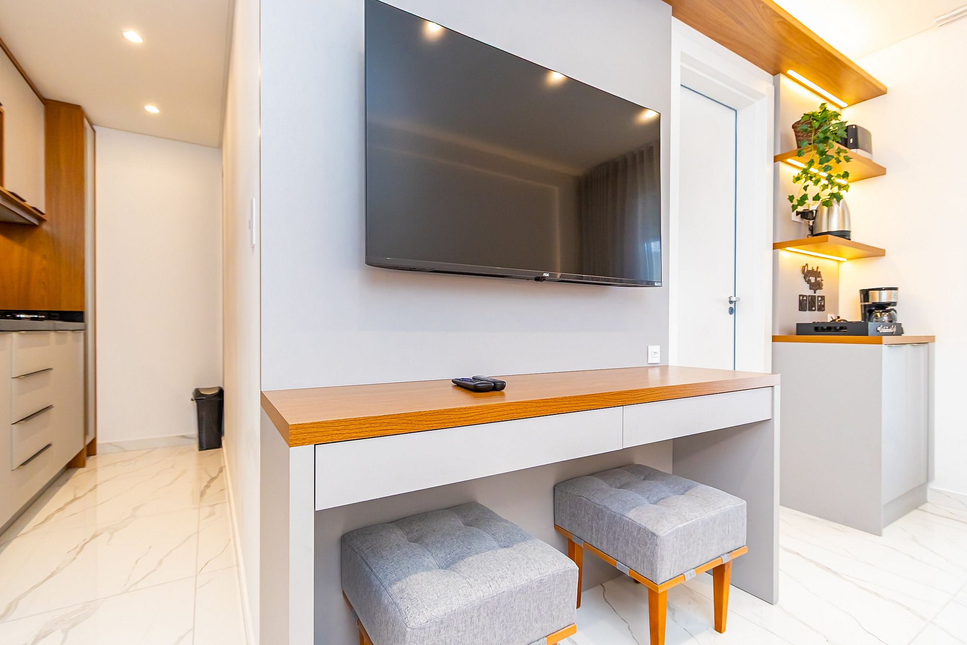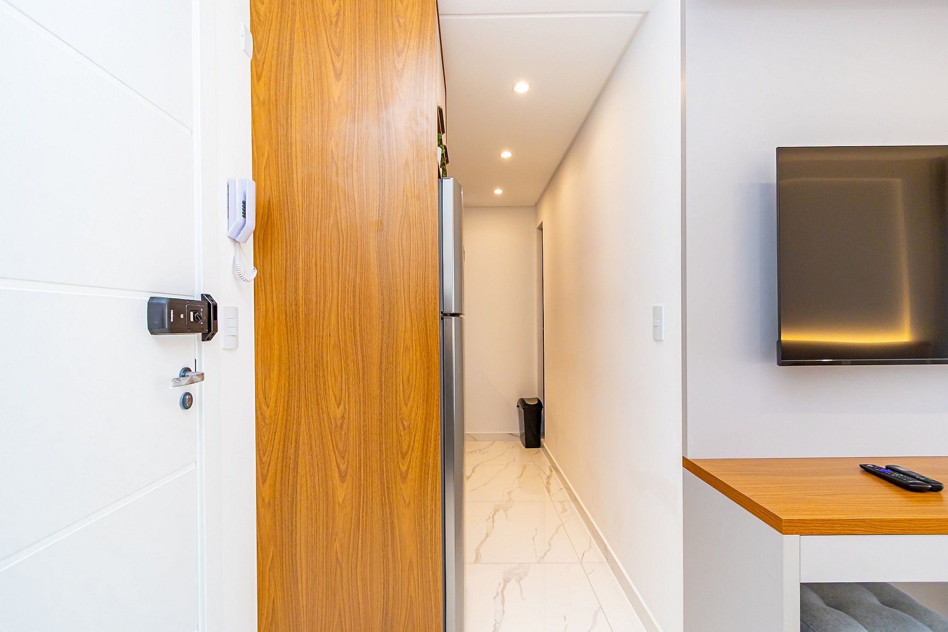 • O apartamento possui fechadura eletrônica, para aparecer o teclado numérico encoste a mão na fechadura, digite a senha e aperte o botão do cadeado aberto;