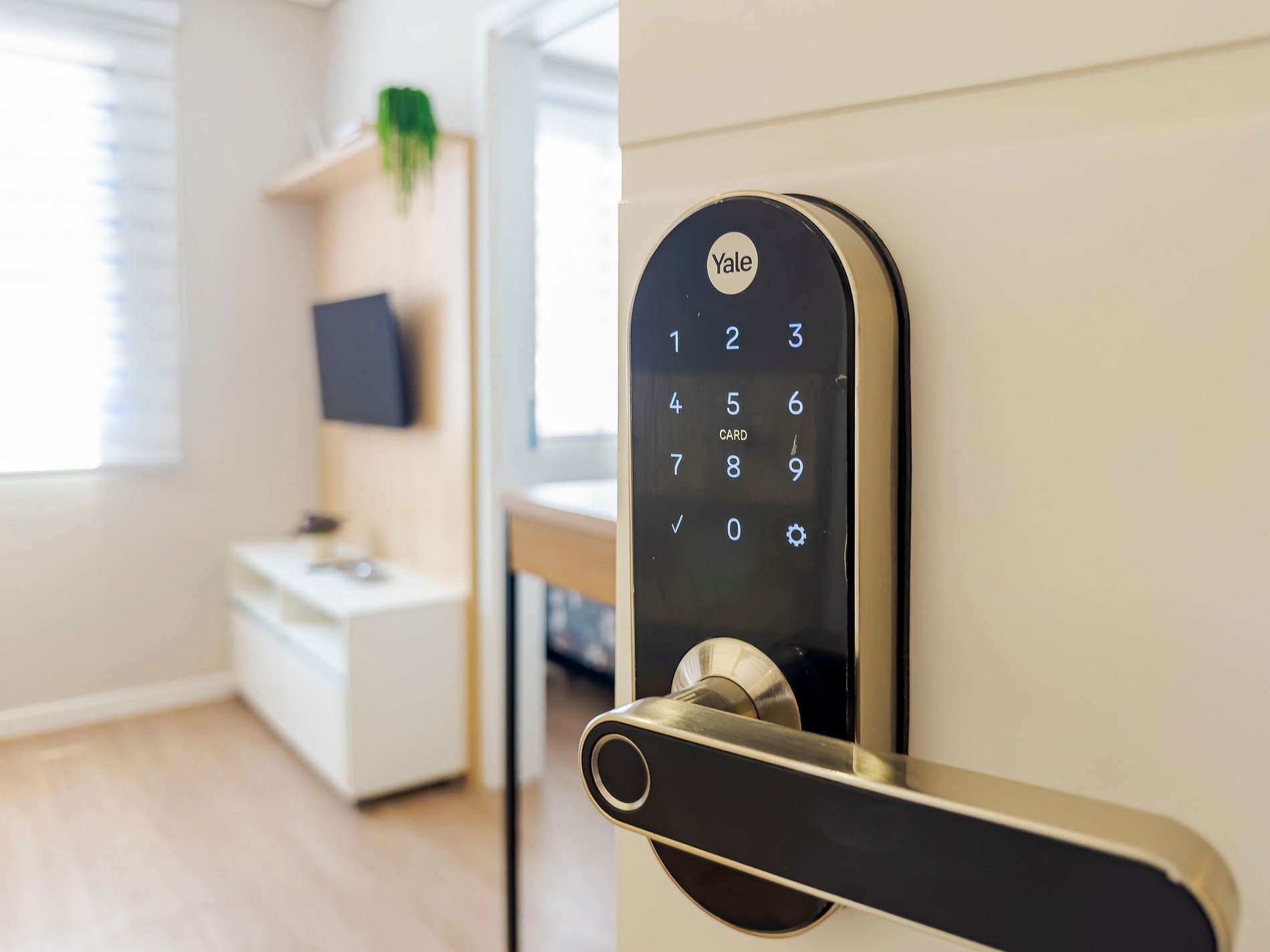• O apartamento possui fechadura eletrônica, para aparecer o teclado numérico encoste a mão na fechadura, digite a senha e aperte o botão do cadeado aberto;