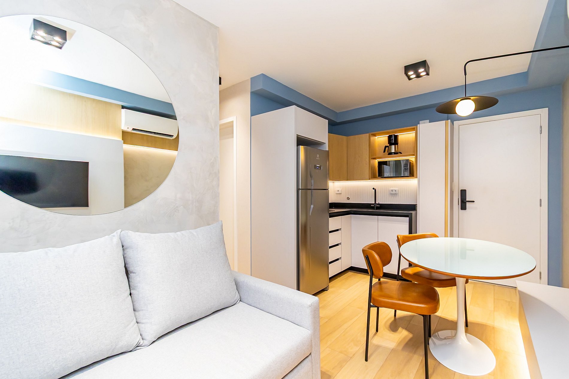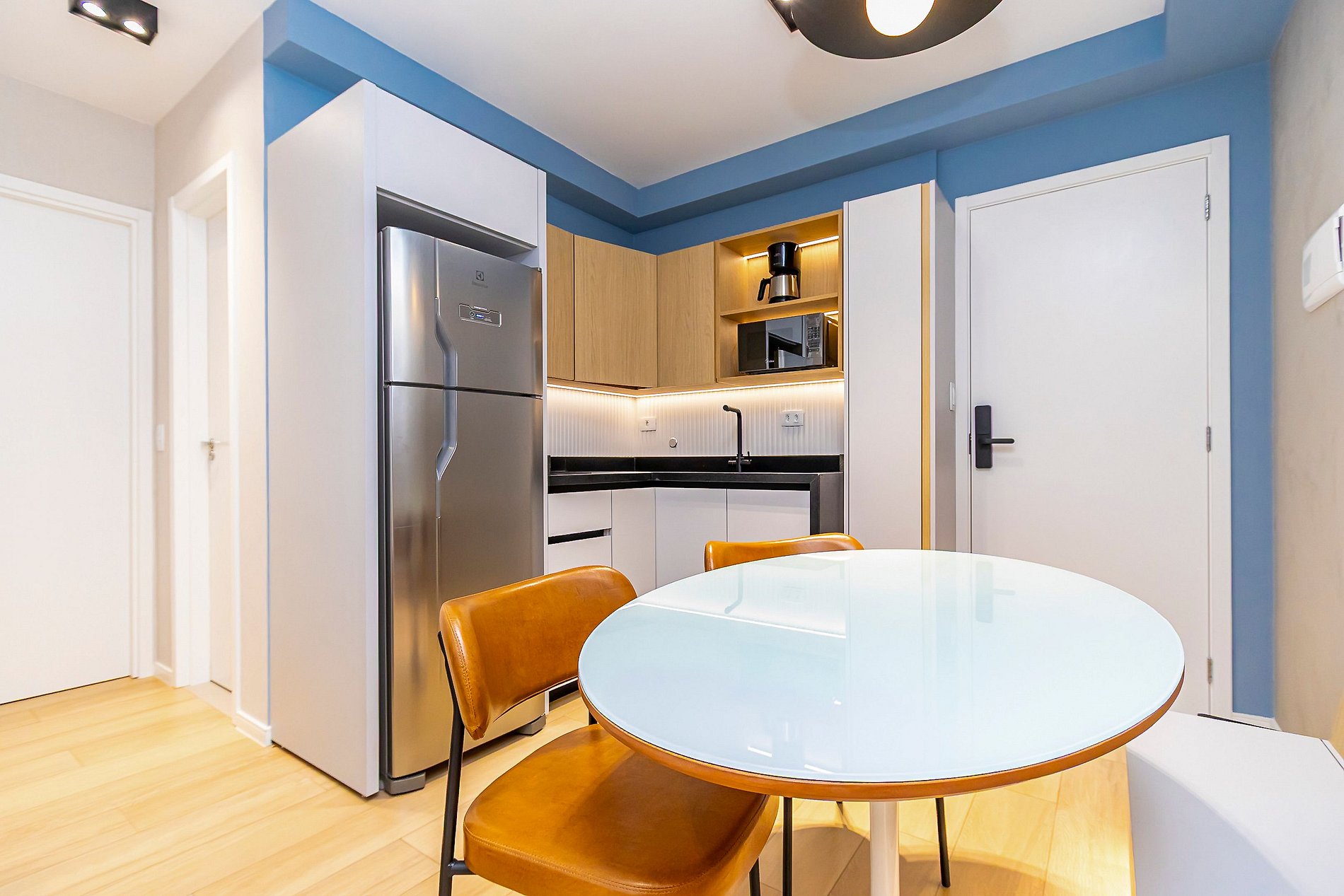 • O apartamento possui fechadura eletrônica, para aparecer o teclado numérico encoste a mão na fechadura, digite a senha e aperte o botão do cadeado aberto;