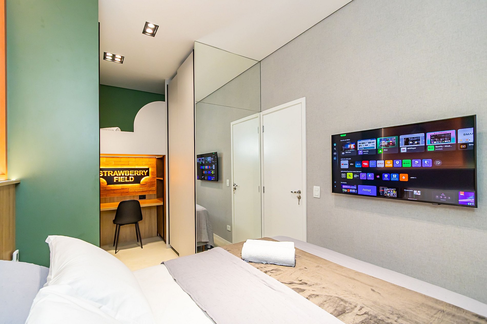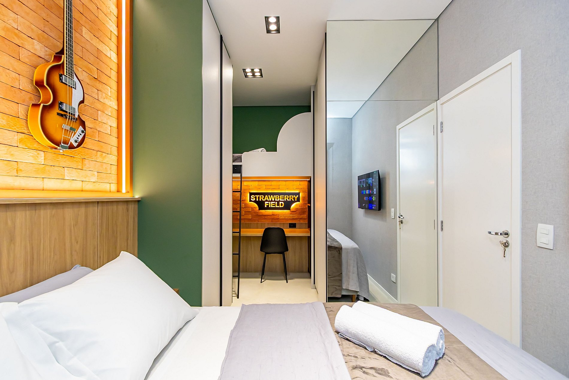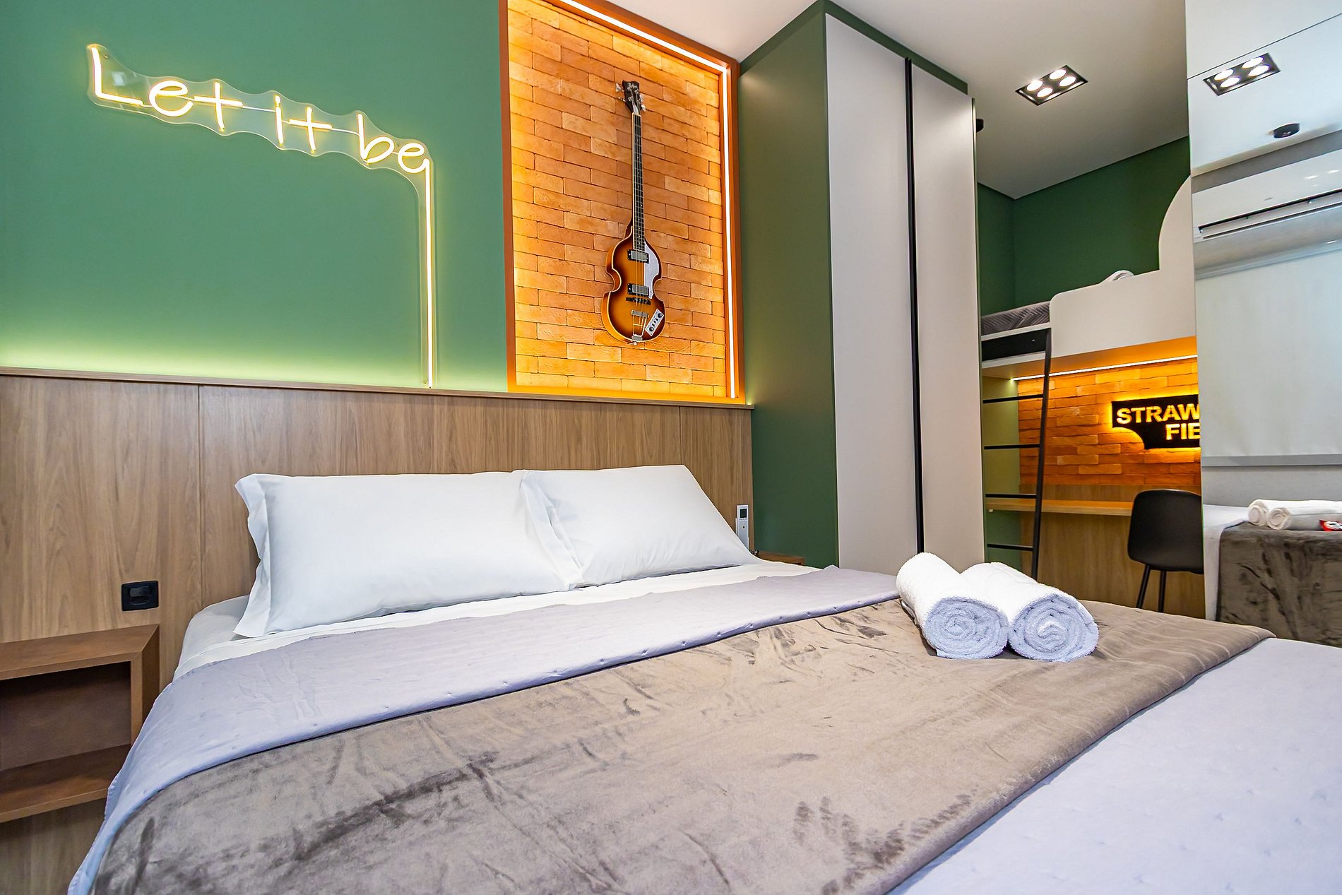 Apartamento premium de 2 quartos, ideal para até 6 hóspedes, com temática exclusiva dos Beatles, trazendo estilo e personalidade em cada detalhe. Totalmente equipado, conta com ar-condicionado em todos os ambientes, cama de casal tamanho queen e sofá-cama confortável. Oferece vaga de garagem inclusa. O apartamento está localizado em um prédio moderno com piscina e áreas de lazer. Uma estadia única, que une conforto, sofisticação e música em um ambiente acolhedor e funcional.