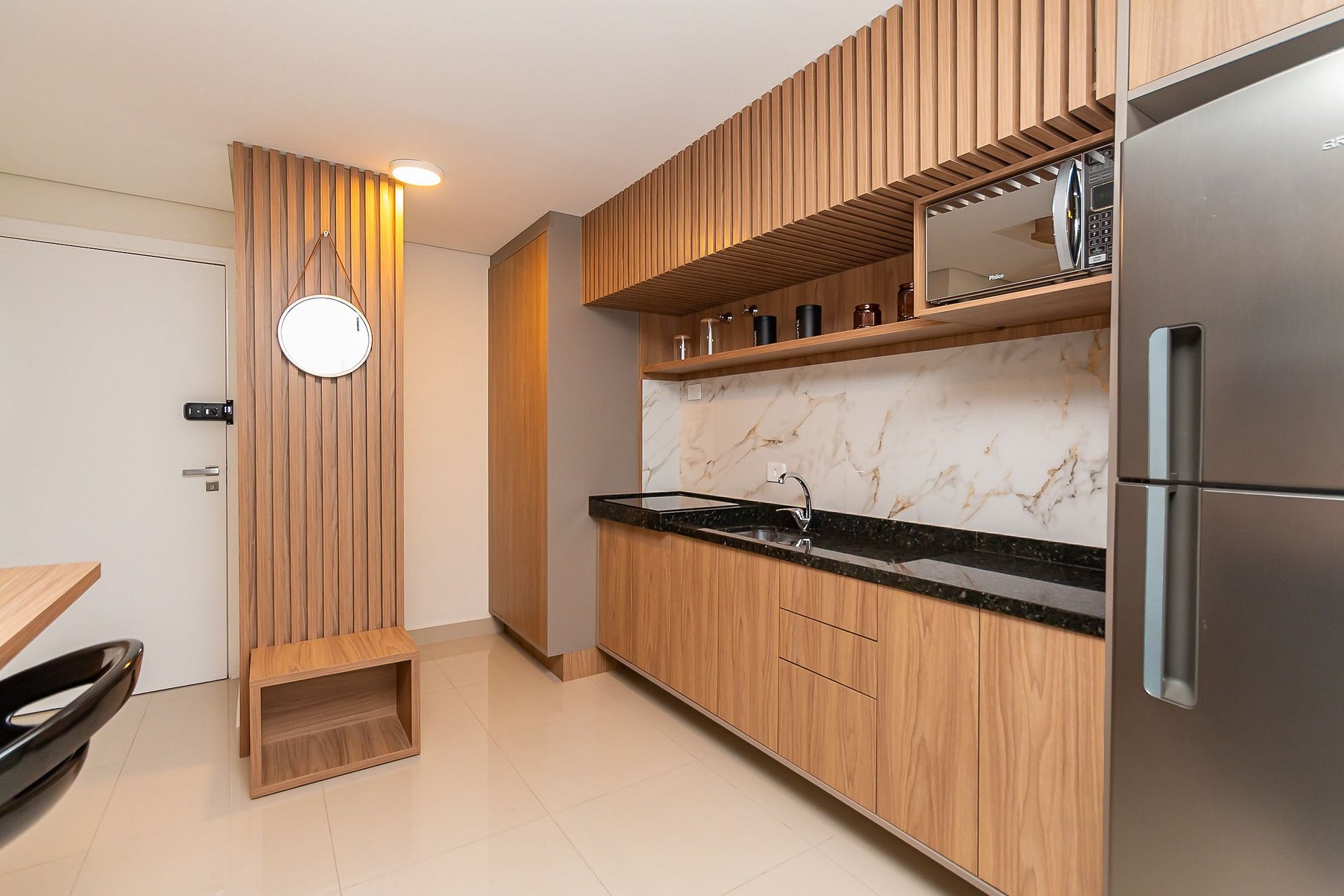 • O apartamento possui fechadura eletrônica, para aparecer o teclado numérico encoste a mão na fechadura, digite a senha e aperte o botão do cadeado aberto;
