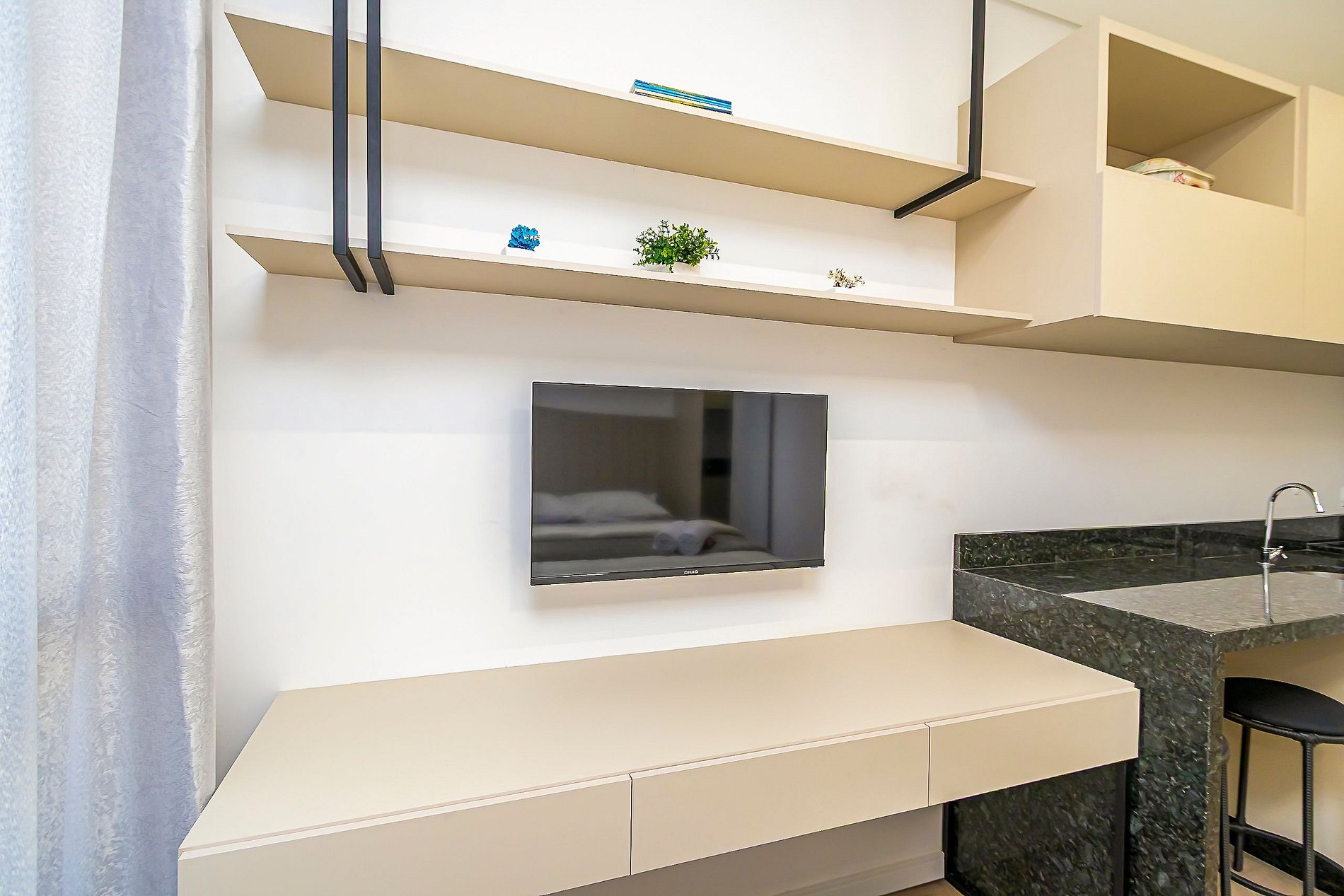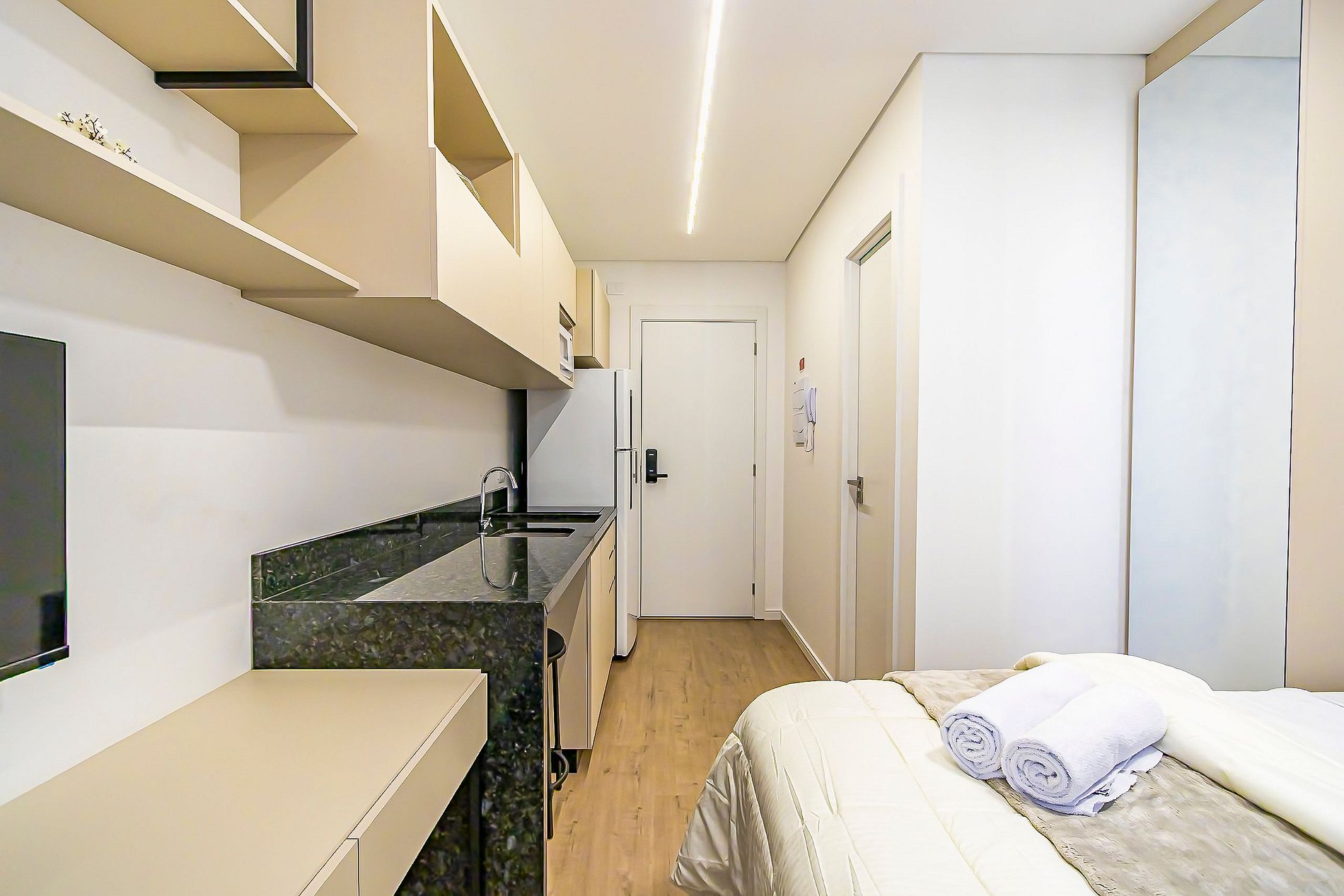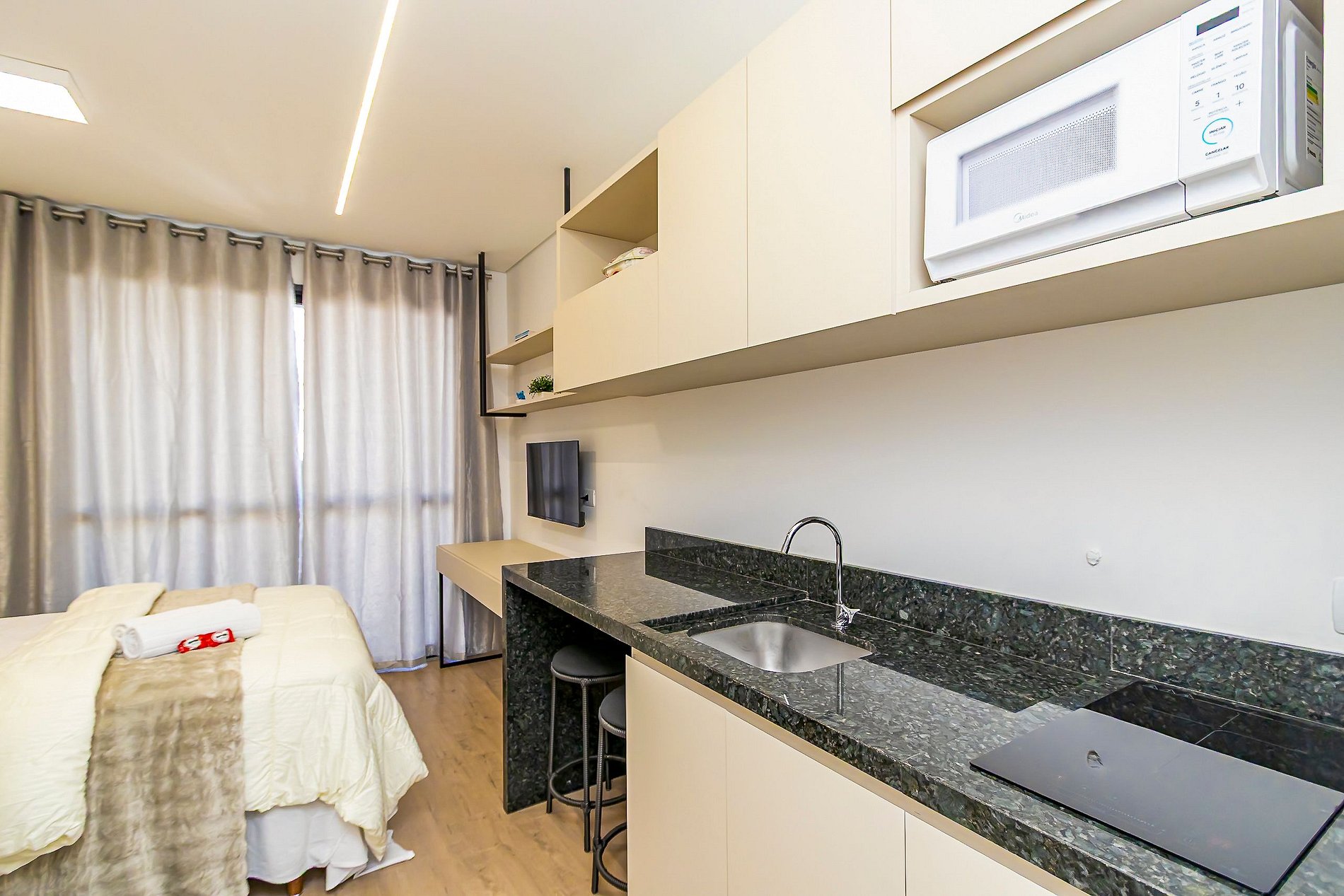 ⌂ Studio totalmente mobiliado que oferece as seguintes comodidades aos seus hóspedes: