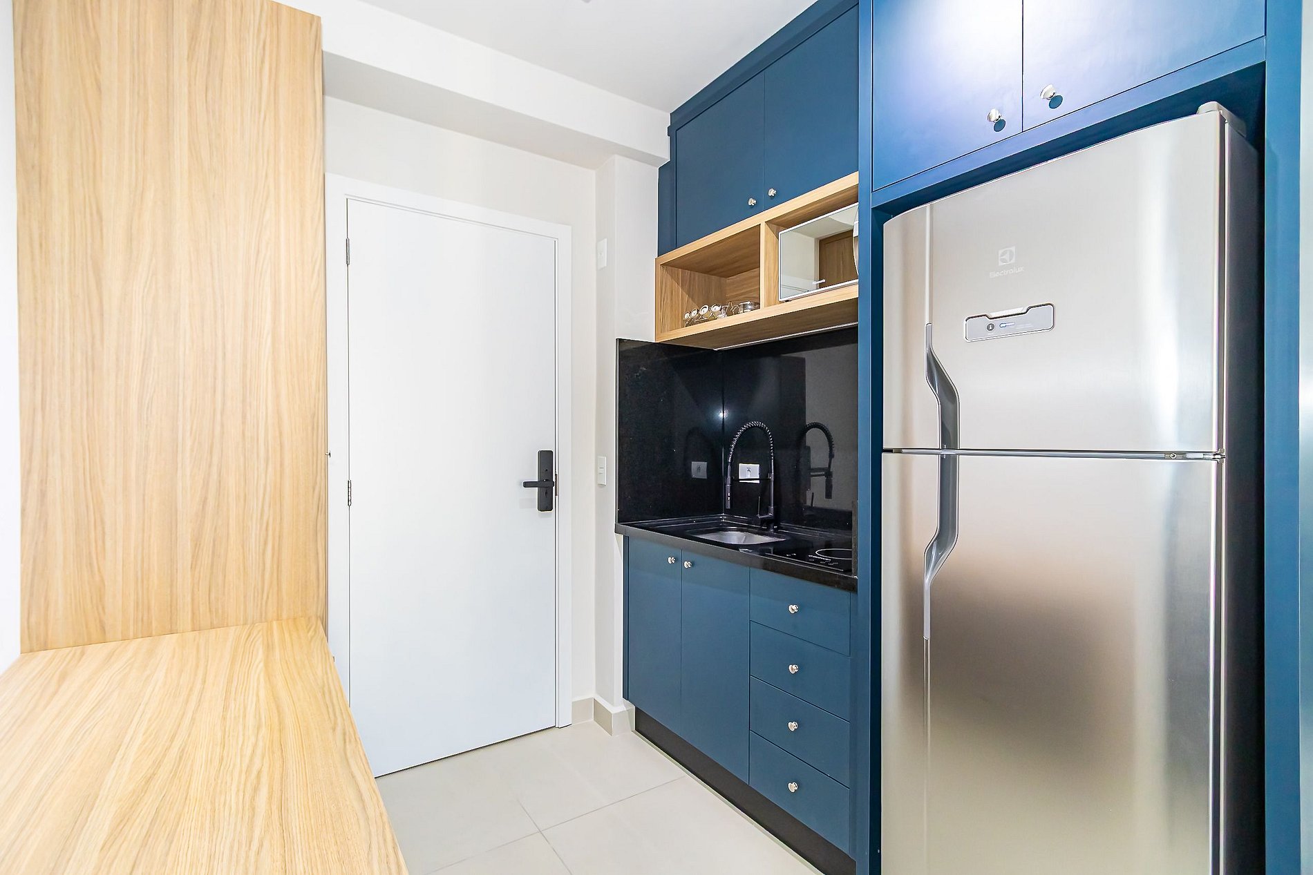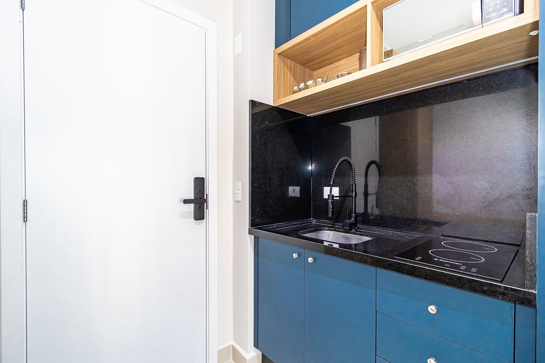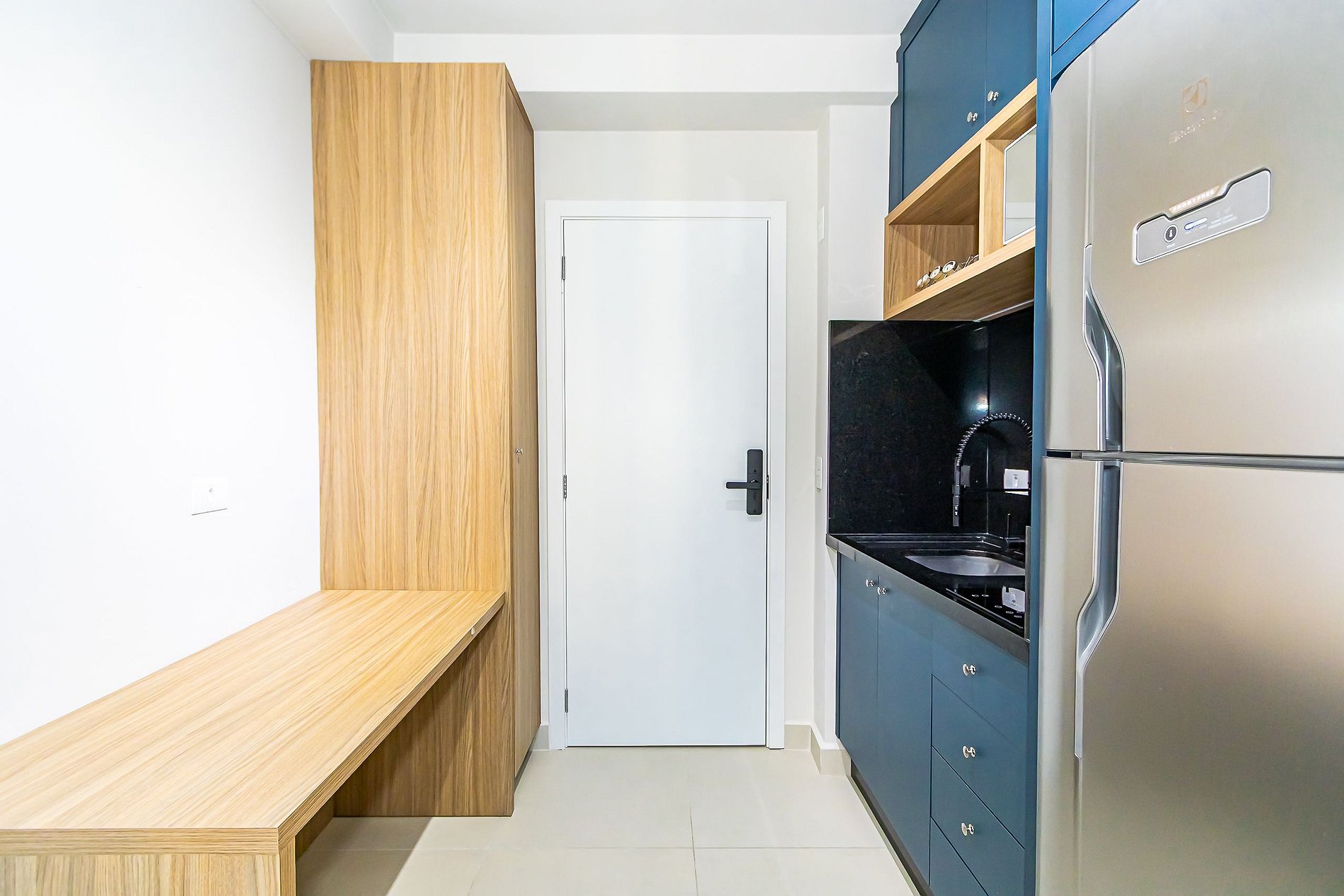 • O apartamento possui fechadura eletrônica, para aparecer o teclado numérico encoste a mão na fechadura, digite a senha e aperte o botão do cadeado aberto;
