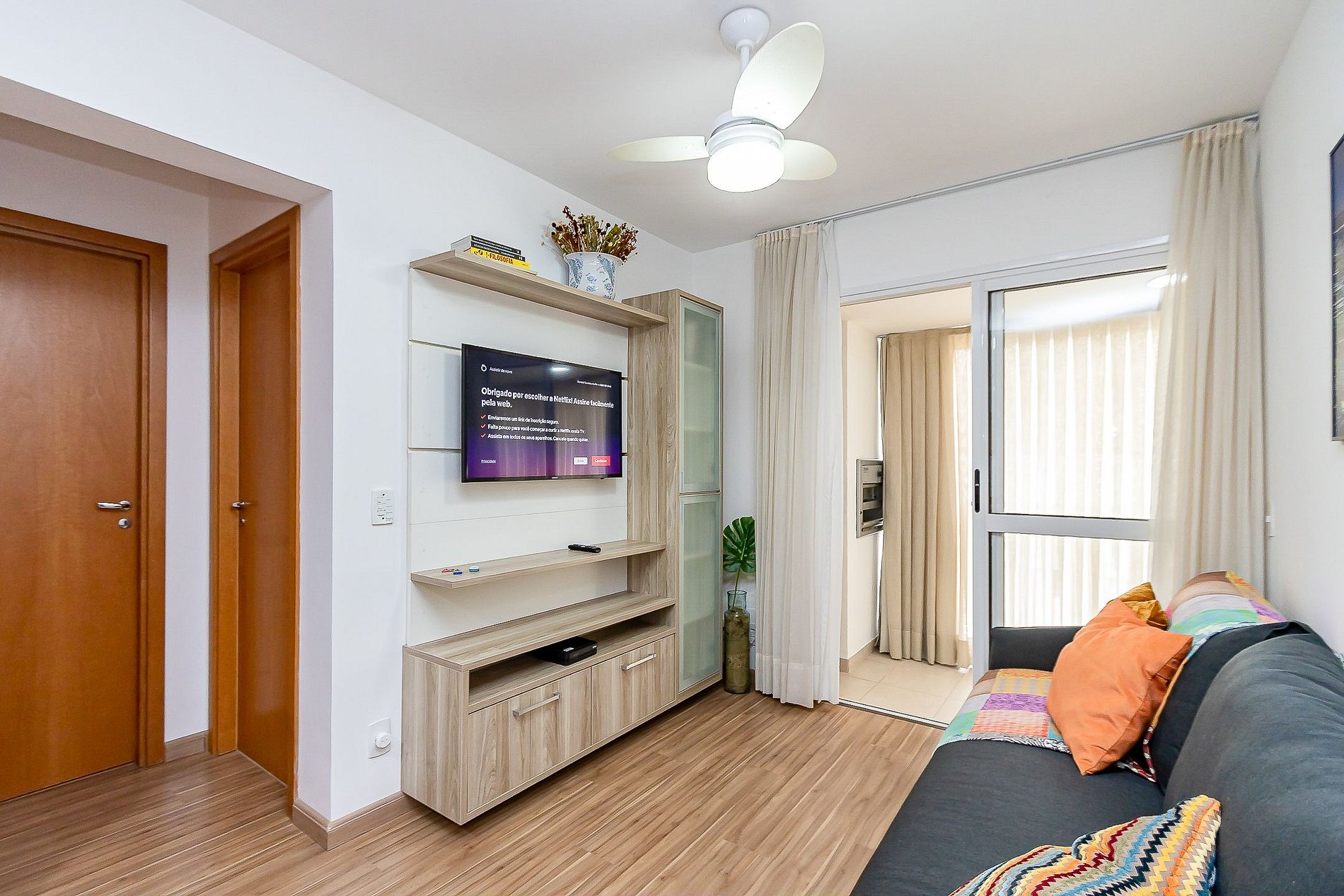 • O apartamento possui fechadura eletrônica, para aparecer o teclado numérico encoste a mão na fechadura, digite a senha e aperte o botão do cadeado aberto;
