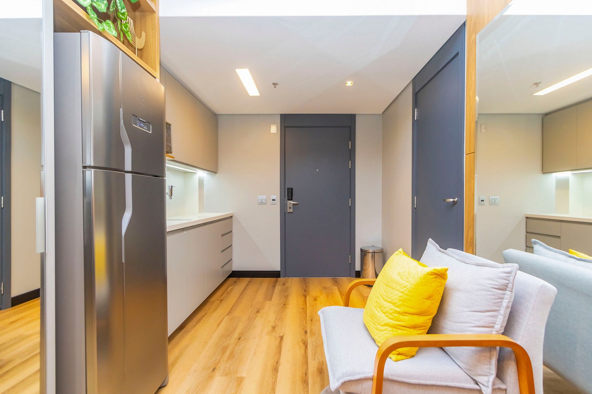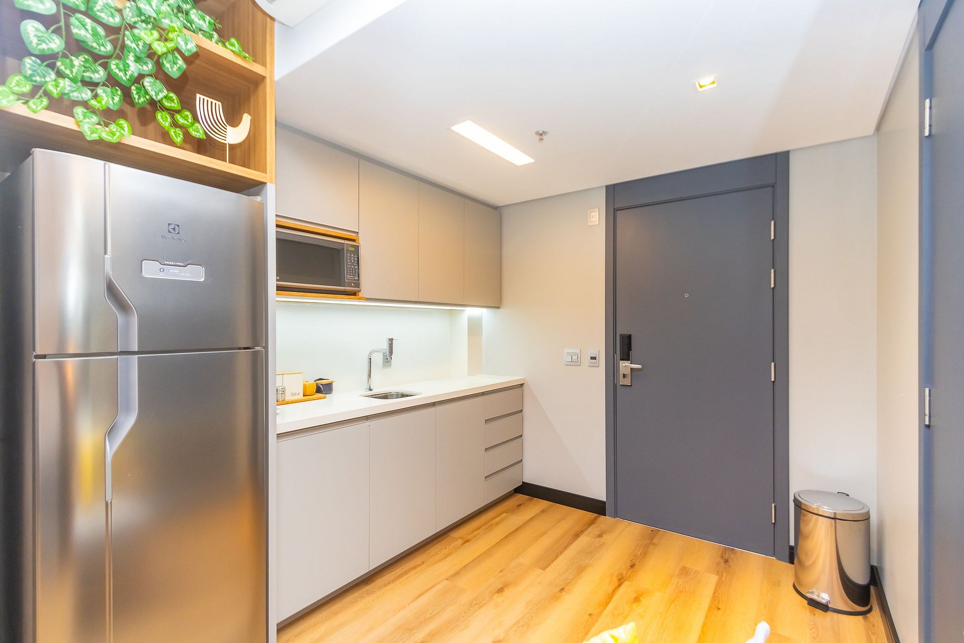 • O apartamento possui fechadura eletrônica, para aparecer o teclado numérico encoste a mão na fechadura, digite a senha e aperte o botão do cadeado aberto;