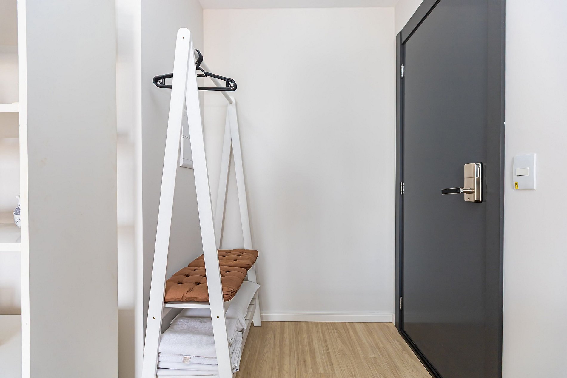 • O apartamento possui fechadura eletrônica, para aparecer o teclado numérico encoste a mão na fechadura, digite a senha e aperte o botão do cadeado aberto;