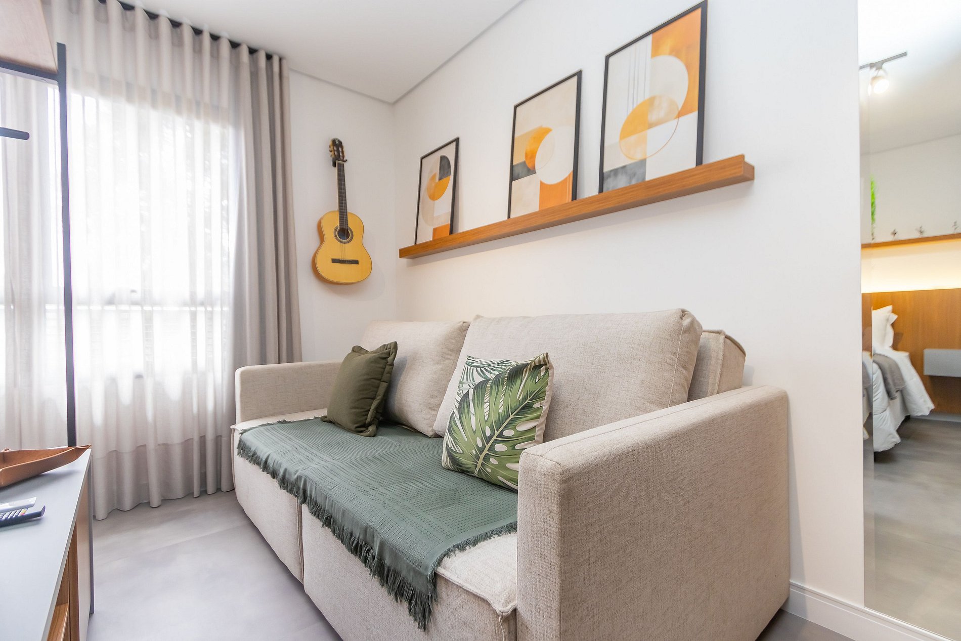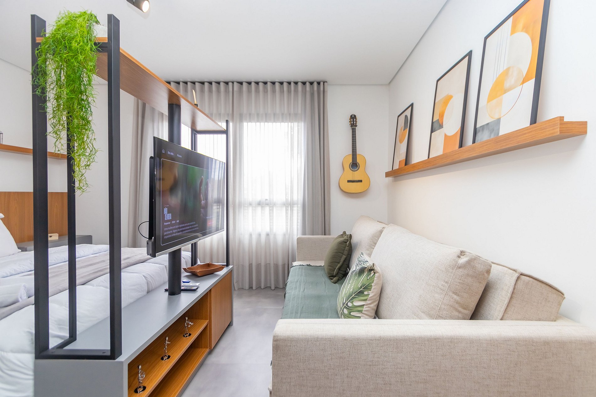 ⌂ Estúdio com Cama de Casal, Sofa-Cama de Casal e Cama Auxiliar totalmente mobiliado que oferece as seguintes comodidades aos seus hóspedes: