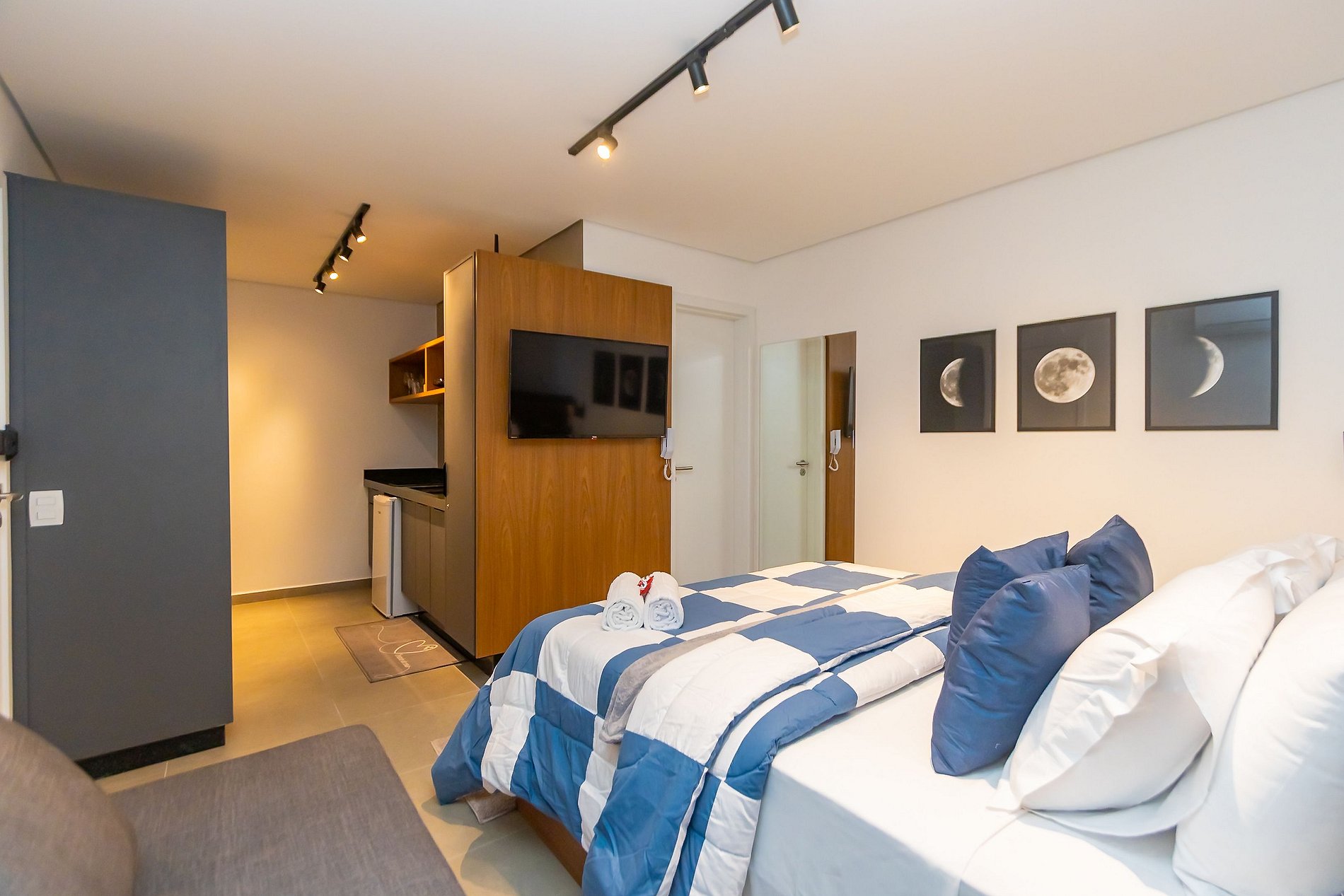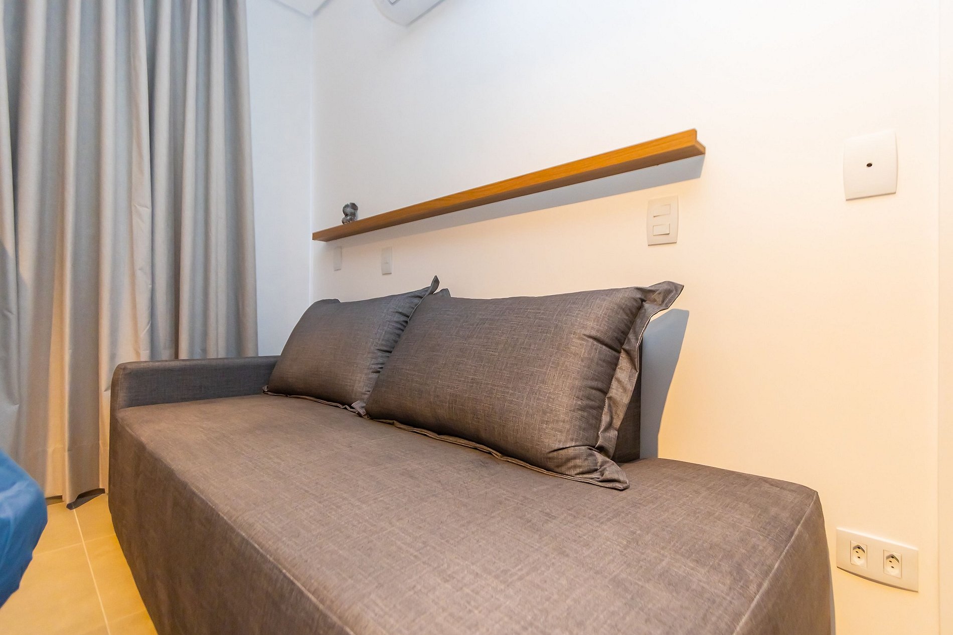 ⌂ Estúdio com Cama de Casal e Sofá-cama e uma cama auxiliar de solteiro, totalmente mobiliado que oferece as seguintes comodidades aos seus hóspedes: