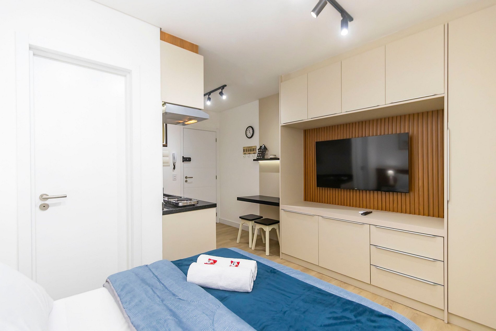 ⌂ Studio totalmente mobiliado que oferece as seguintes comodidades aos seus hóspedes: