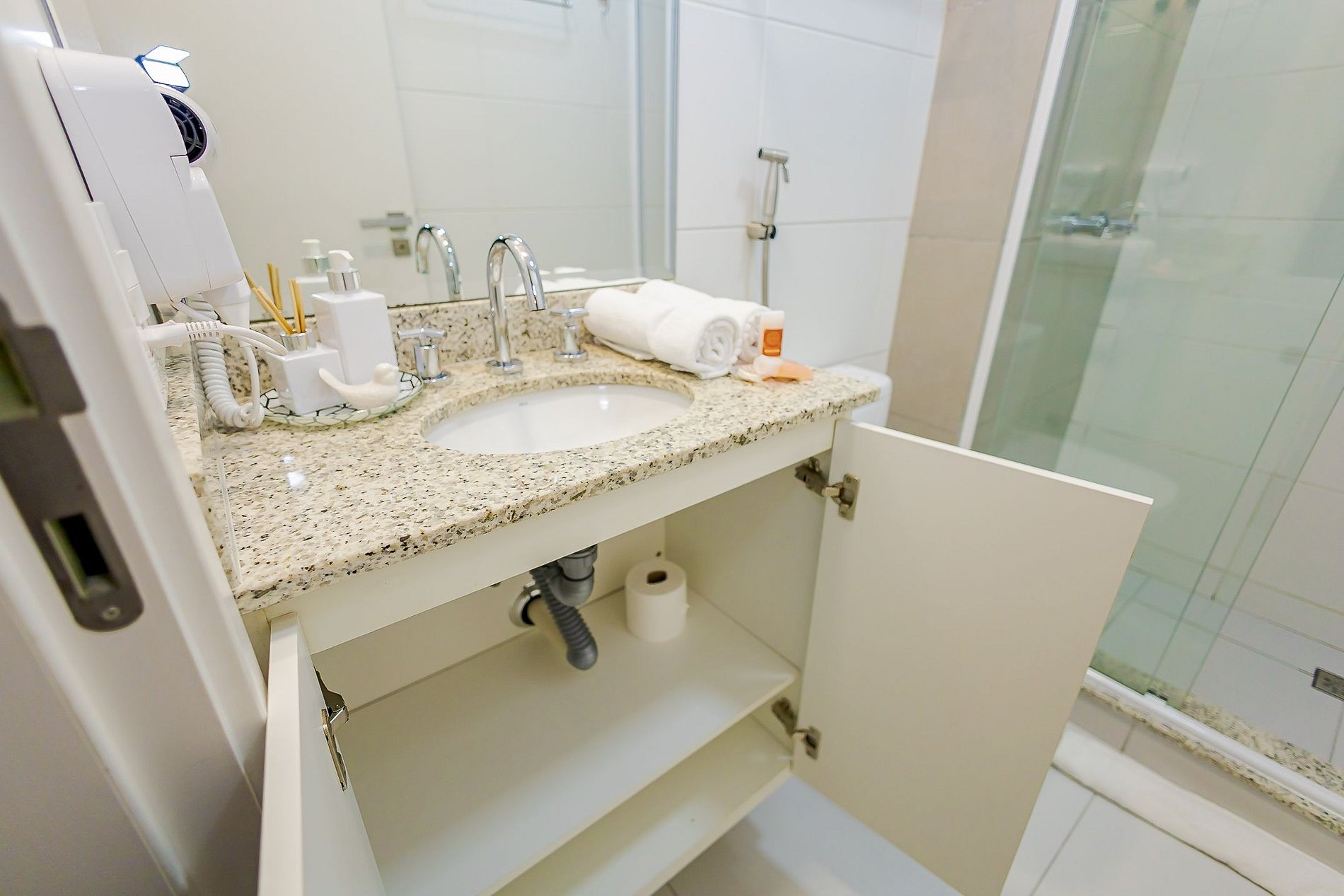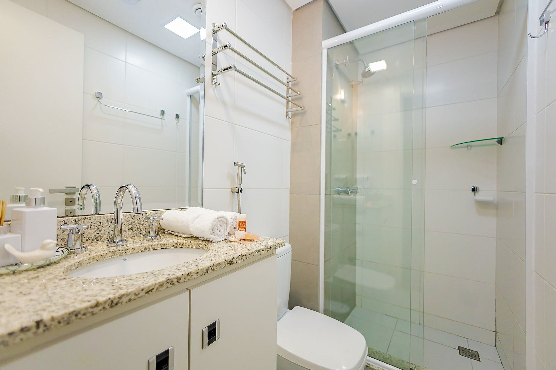 Durante a sua estadia não temos serviço de quarto e nem fazemos a reposição dos itens da sua unidade como: shampoo, condicionador, sabonete, papel higiênico, pano de prato, esponja e detergente de louça, além de pilhas do controle remoto, ar-condicionado e da fechadura eletrônica. A reposição destes itens é de responsabilidade do hóspede titular da reserva.