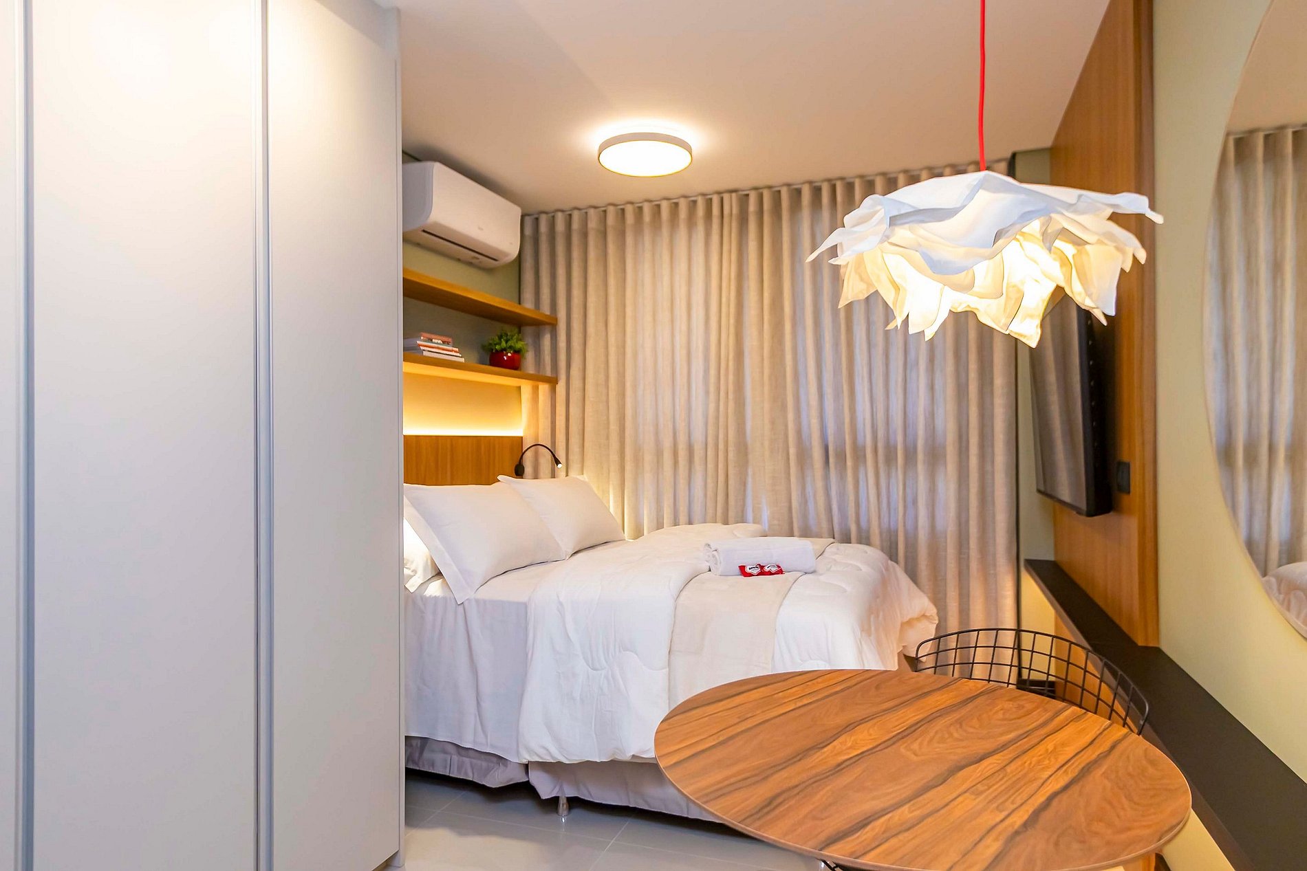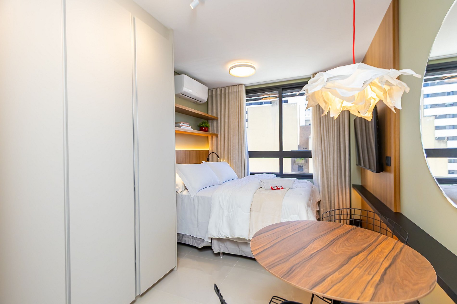 Studio ideal para até 2 pessoas, com decoração moderna, aconchegante e cuidadosamente planejada para proporcionar conforto e bem-estar. Localizado em um edifício novo, com estrutura completa e de alto padrão. Situado em uma ótima região, com fácil acesso a restaurantes, comércios, serviços e transporte. Uma excelente opção para quem busca praticidade, elegância e uma estadia agradável, com estilo e comodidade em cada detalhe.