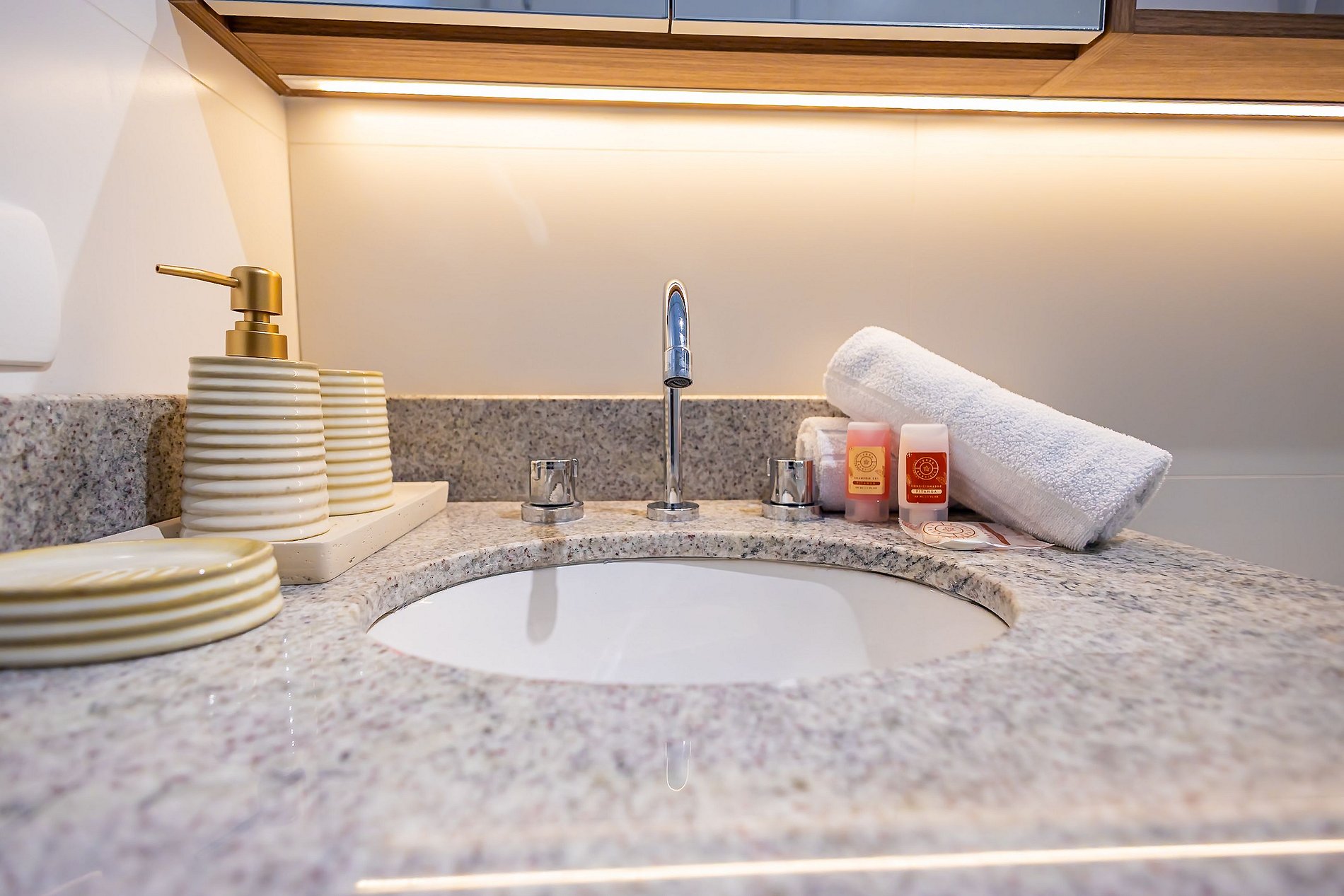 Durante a sua estadia não temos serviço de quarto e nem fazemos a reposição dos itens da sua unidade como: shampoo, condicionador, sabonete, papel higiênico, pano de prato, esponja e detergente de louça, além de pilhas do controle remoto, ar-condicionado e da fechadura eletrônica. A reposição destes itens é de responsabilidade do hóspede titular da reserva.